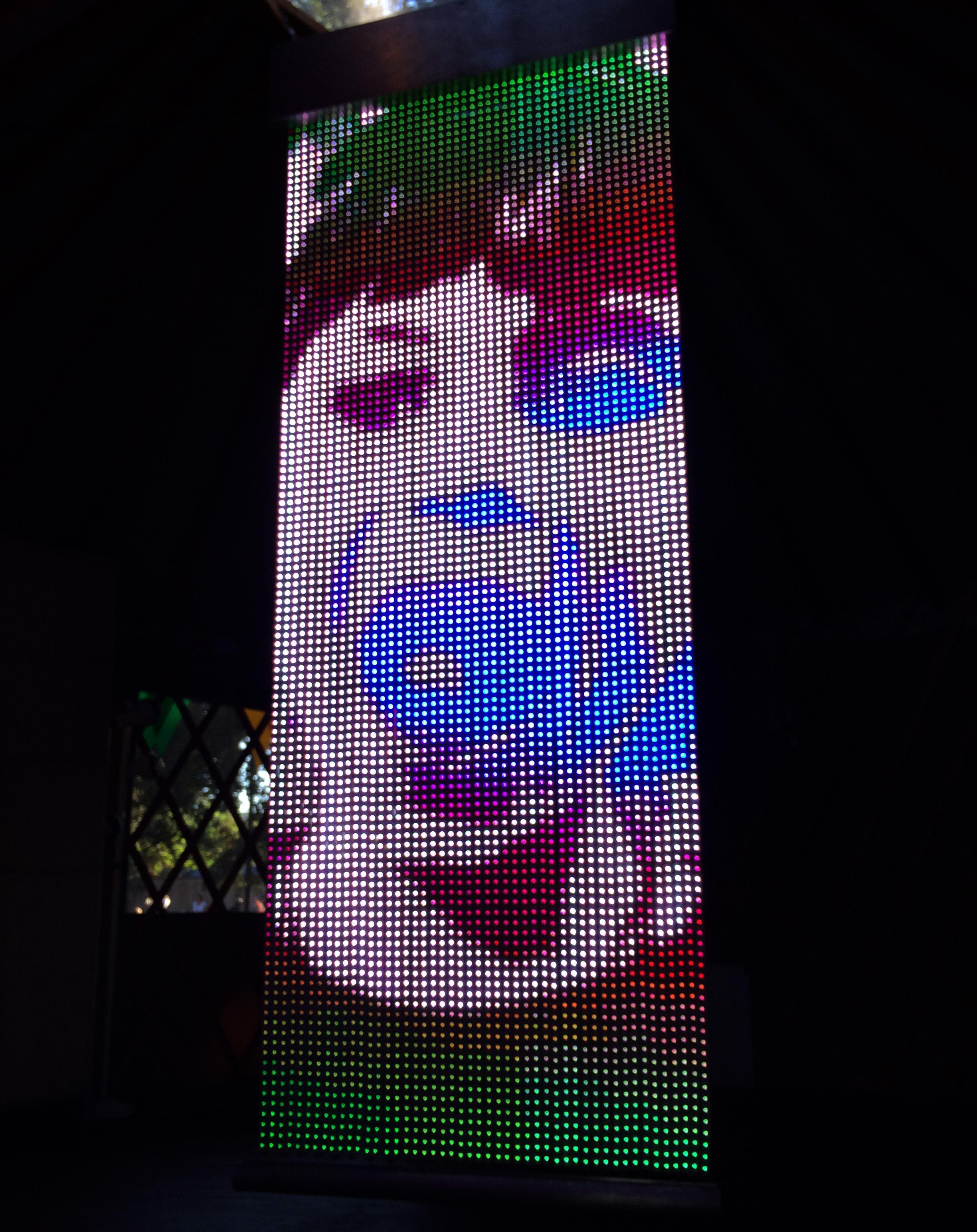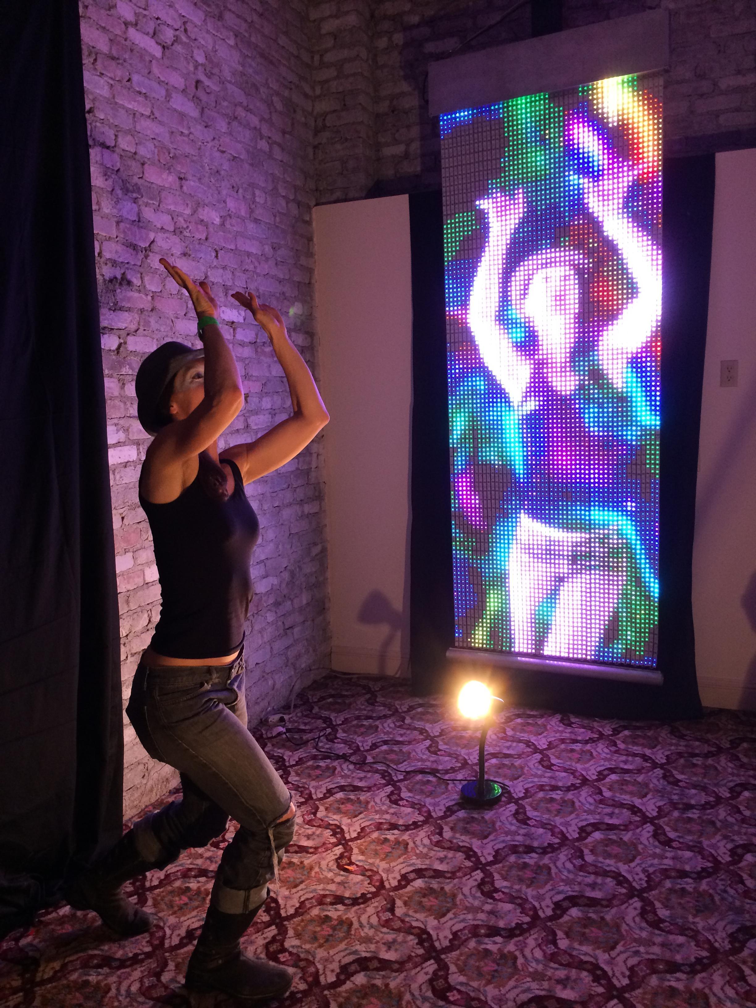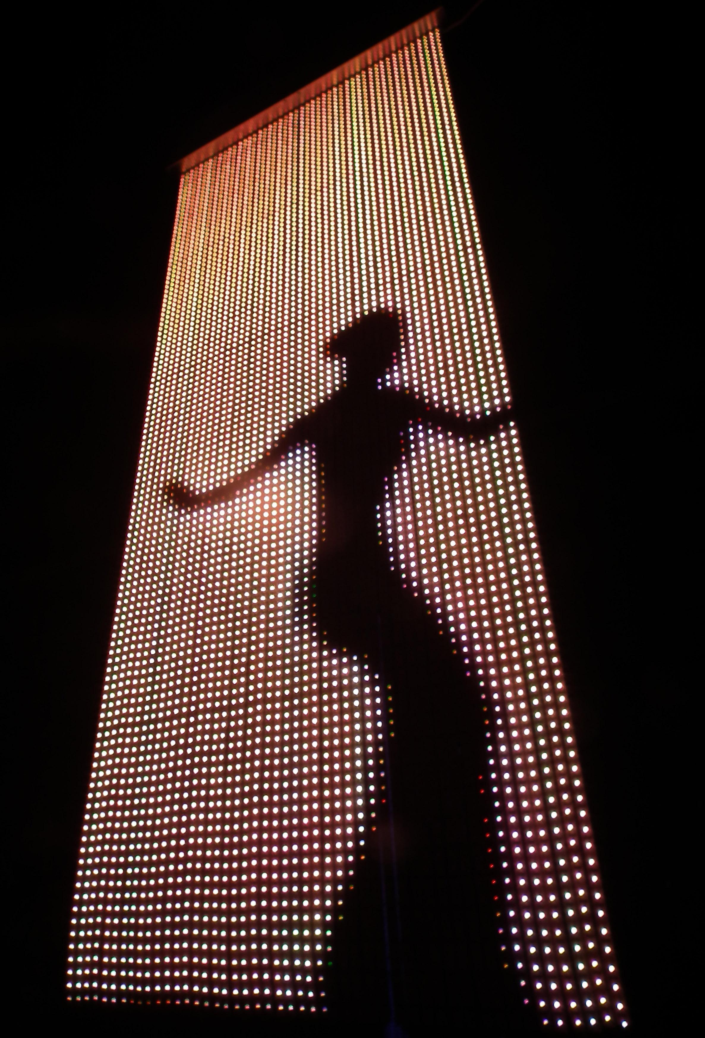 Light Curtain is 5,760 LEDs in a 24” x 99” rectangular panel. The tall, thin aspect ratio of Light Curtain fits the aspect ratio of a standing person. Therefore Missive is often used as an interactive display, combining the silhouette and features of a visitor with various animated backgrounds and foregrounds.