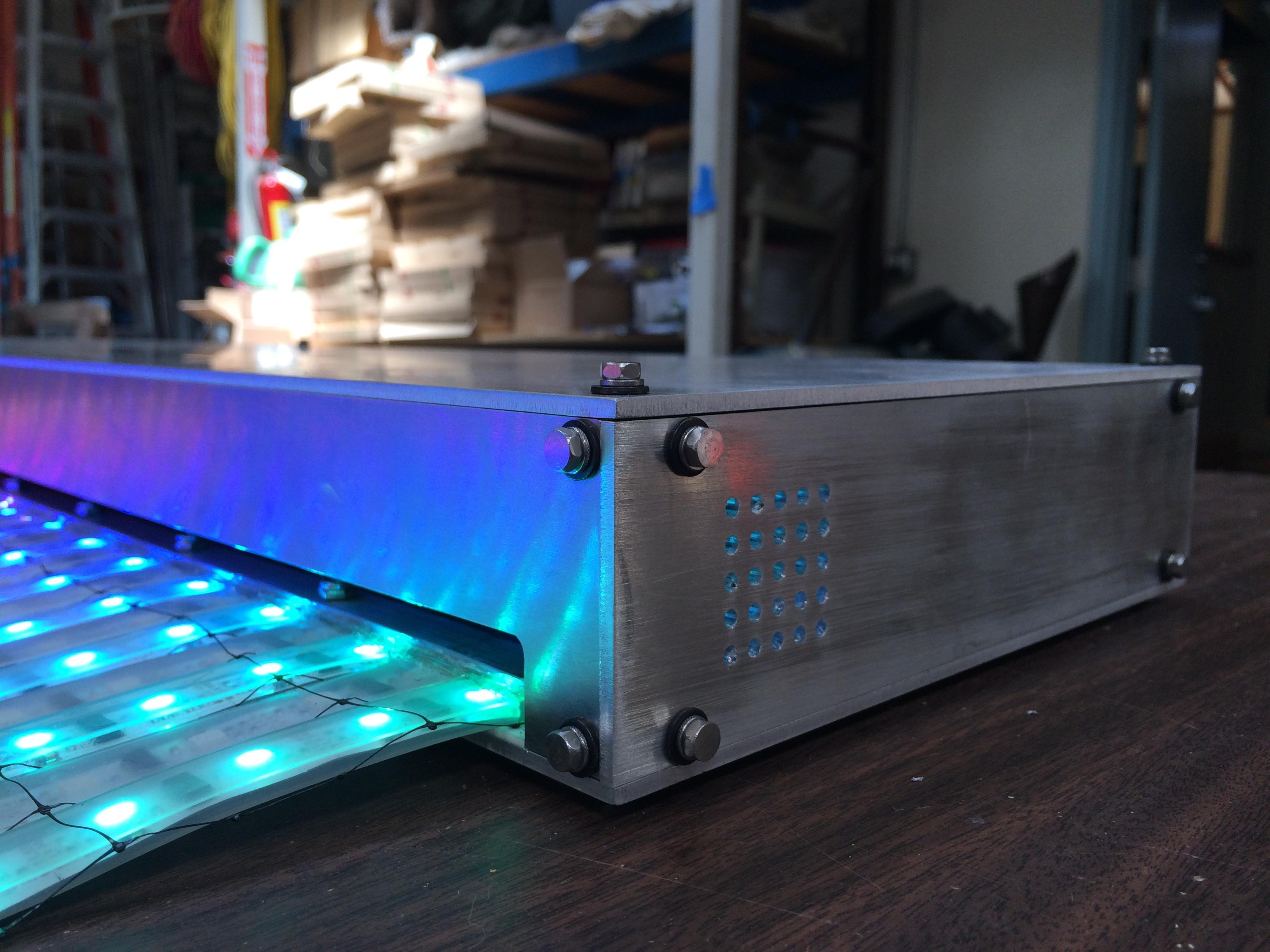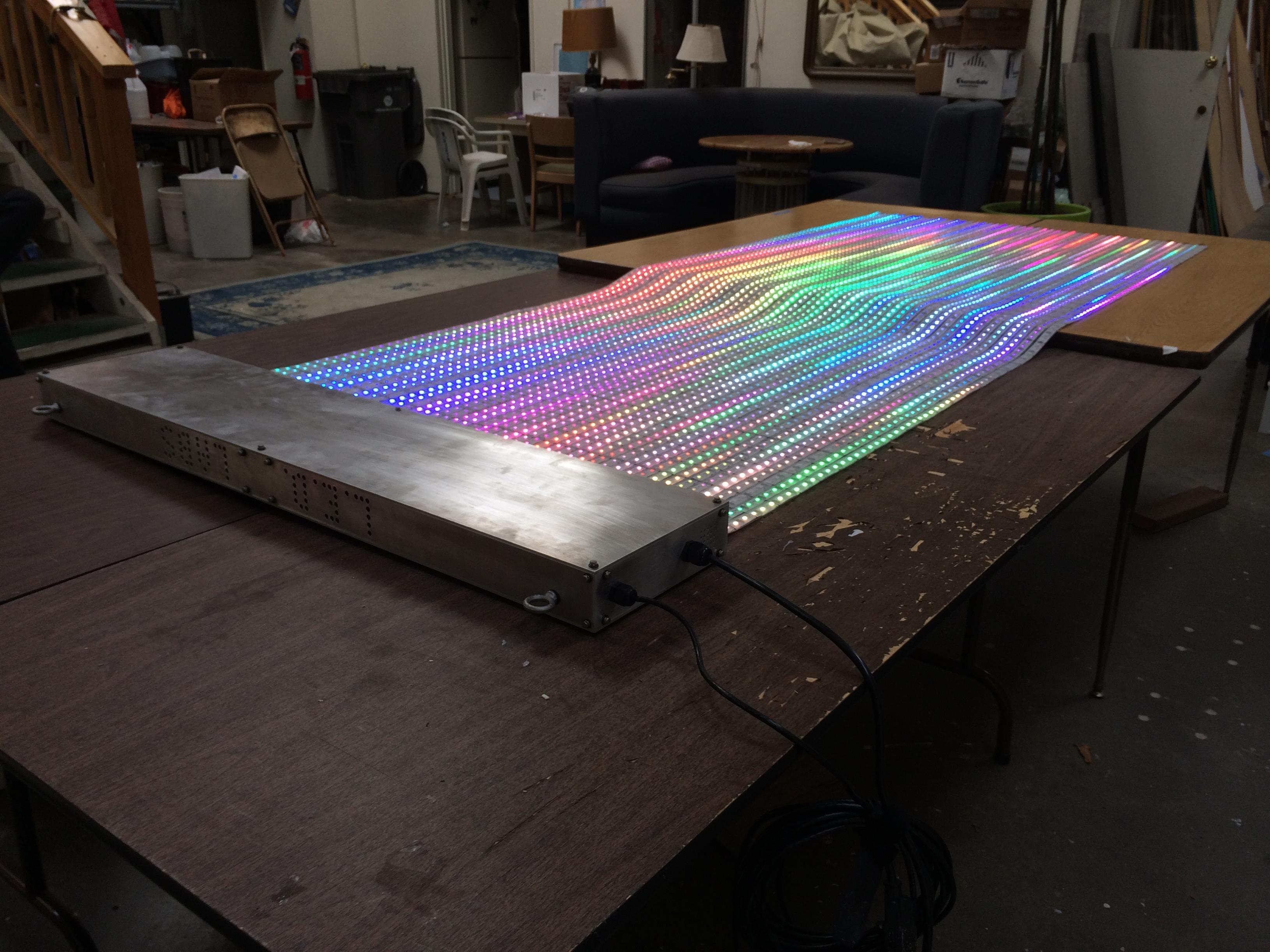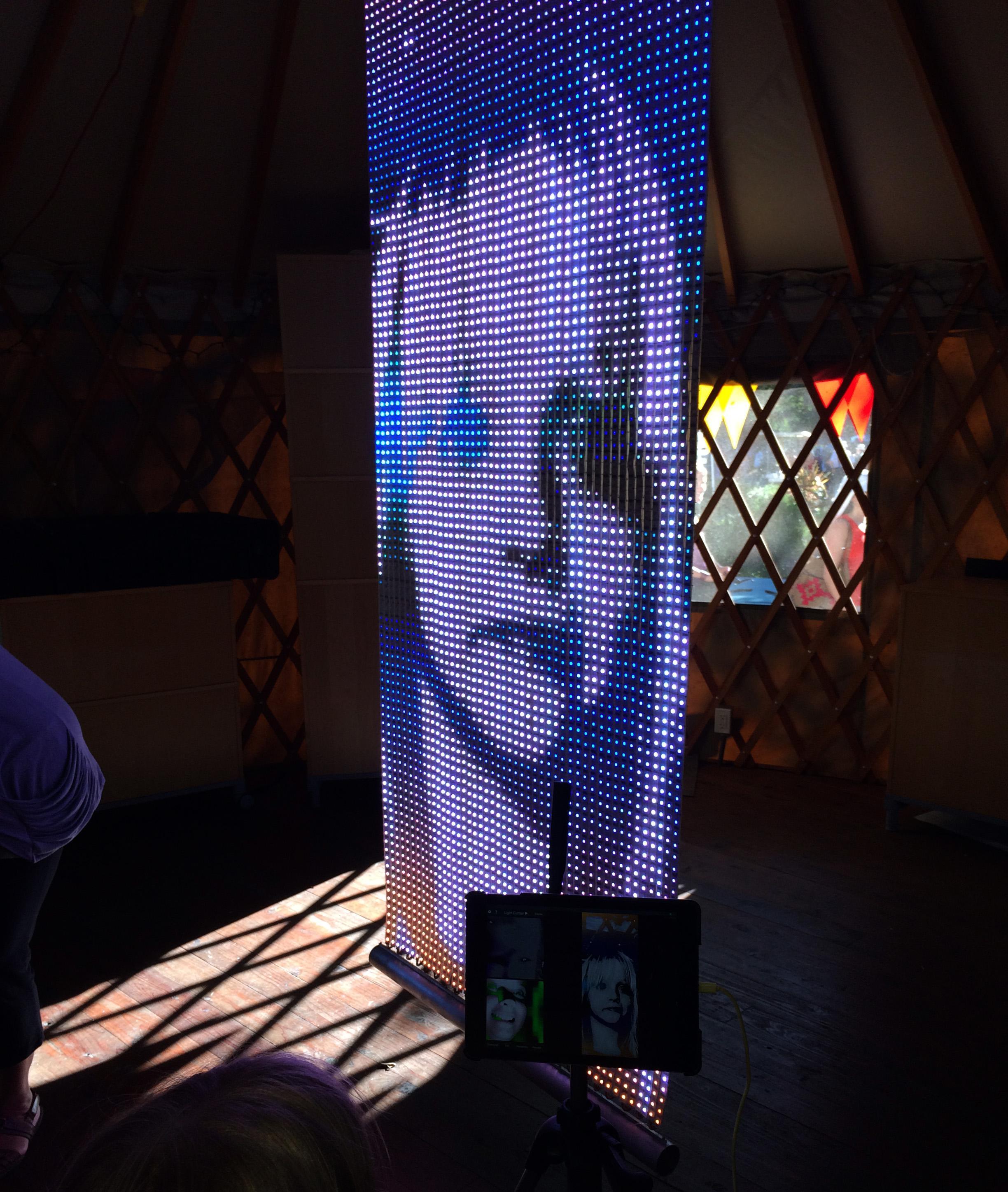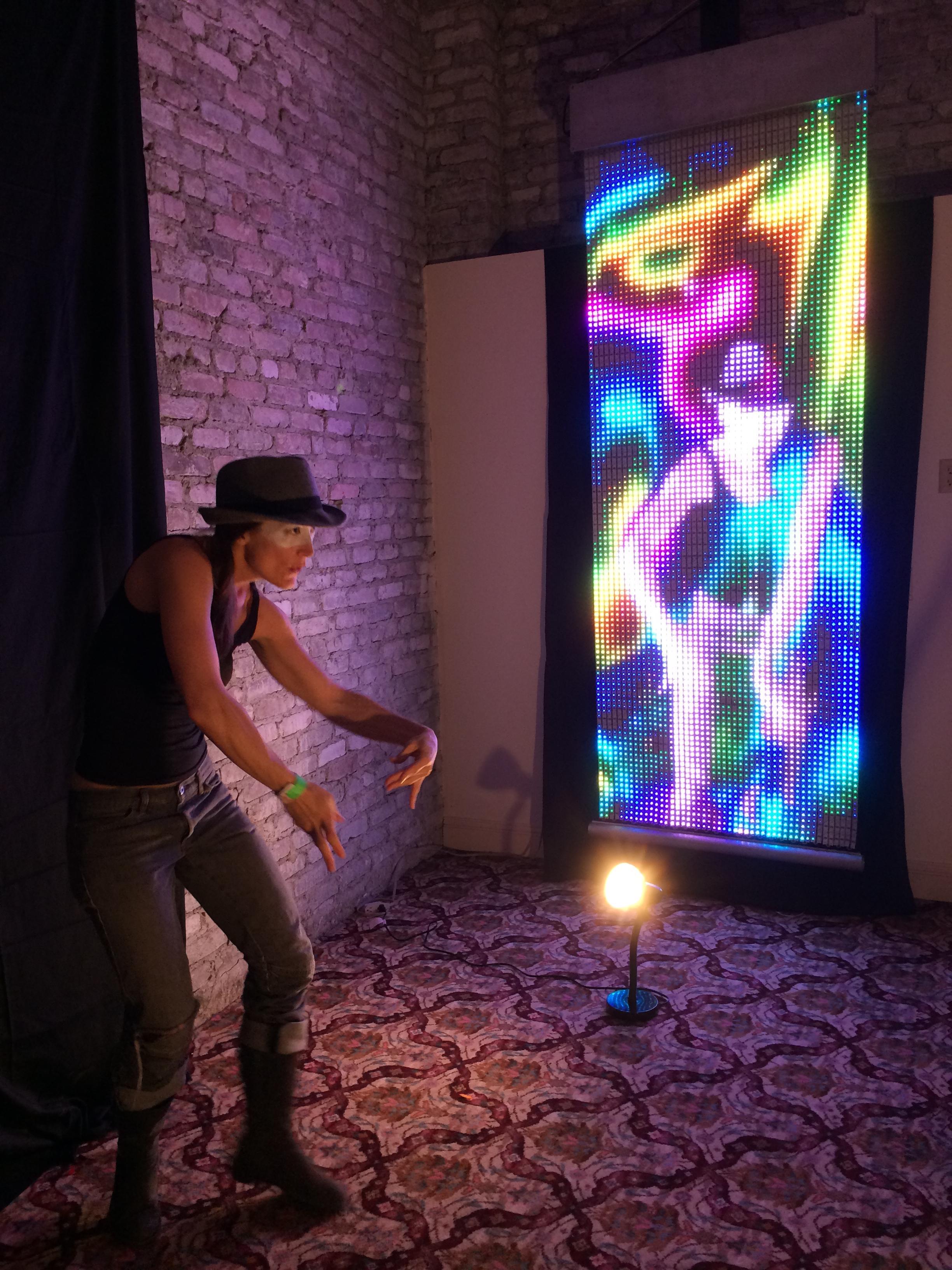 Light Curtain is 5,760 LEDs in a 24” x 99” rectangular panel. The tall, thin aspect ratio of Light Curtain fits the aspect ratio of a standing person. Therefore Missive is often used as an interactive display, combining the silhouette and features of a visitor with various animated backgrounds and foregrounds.