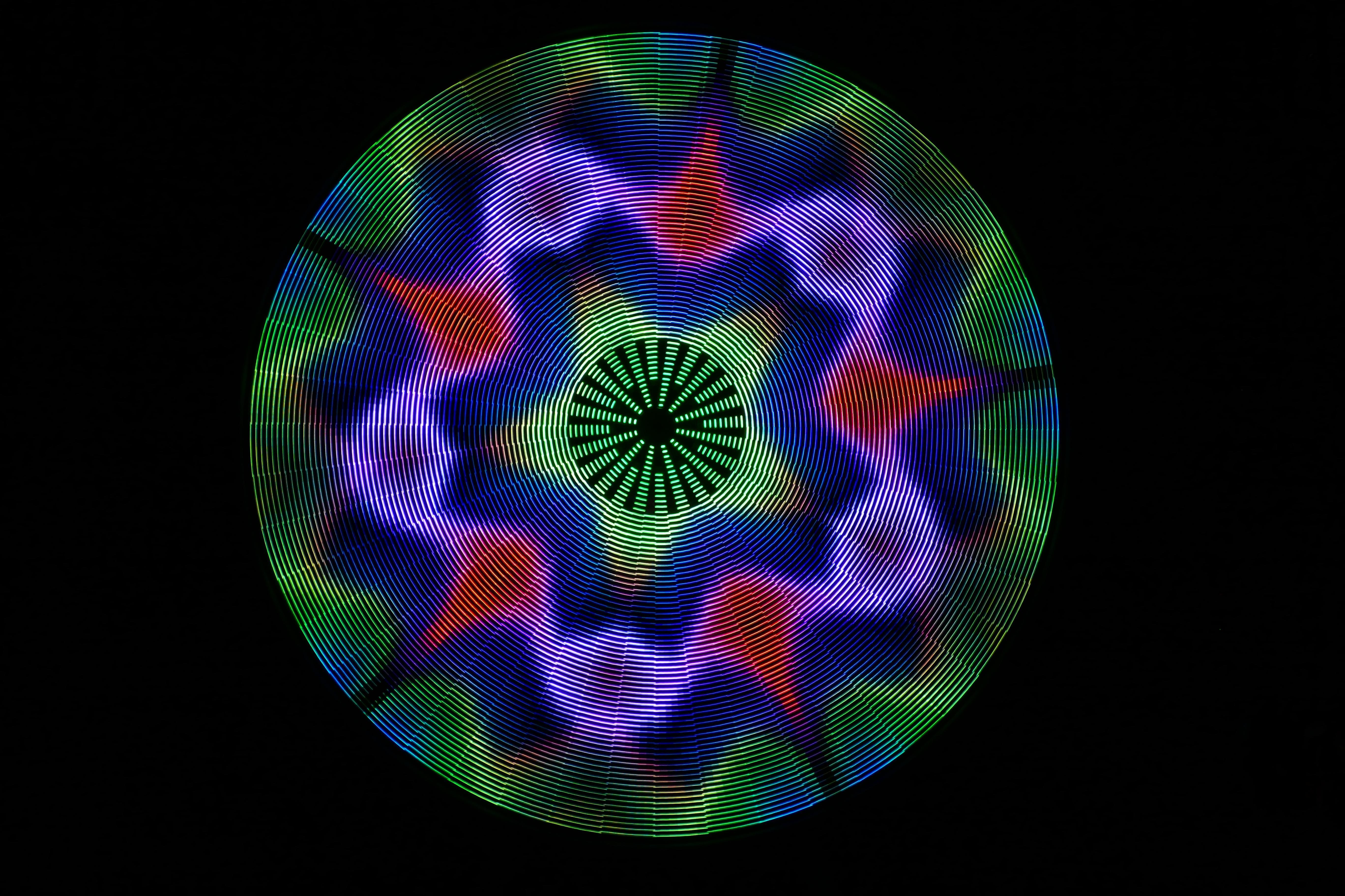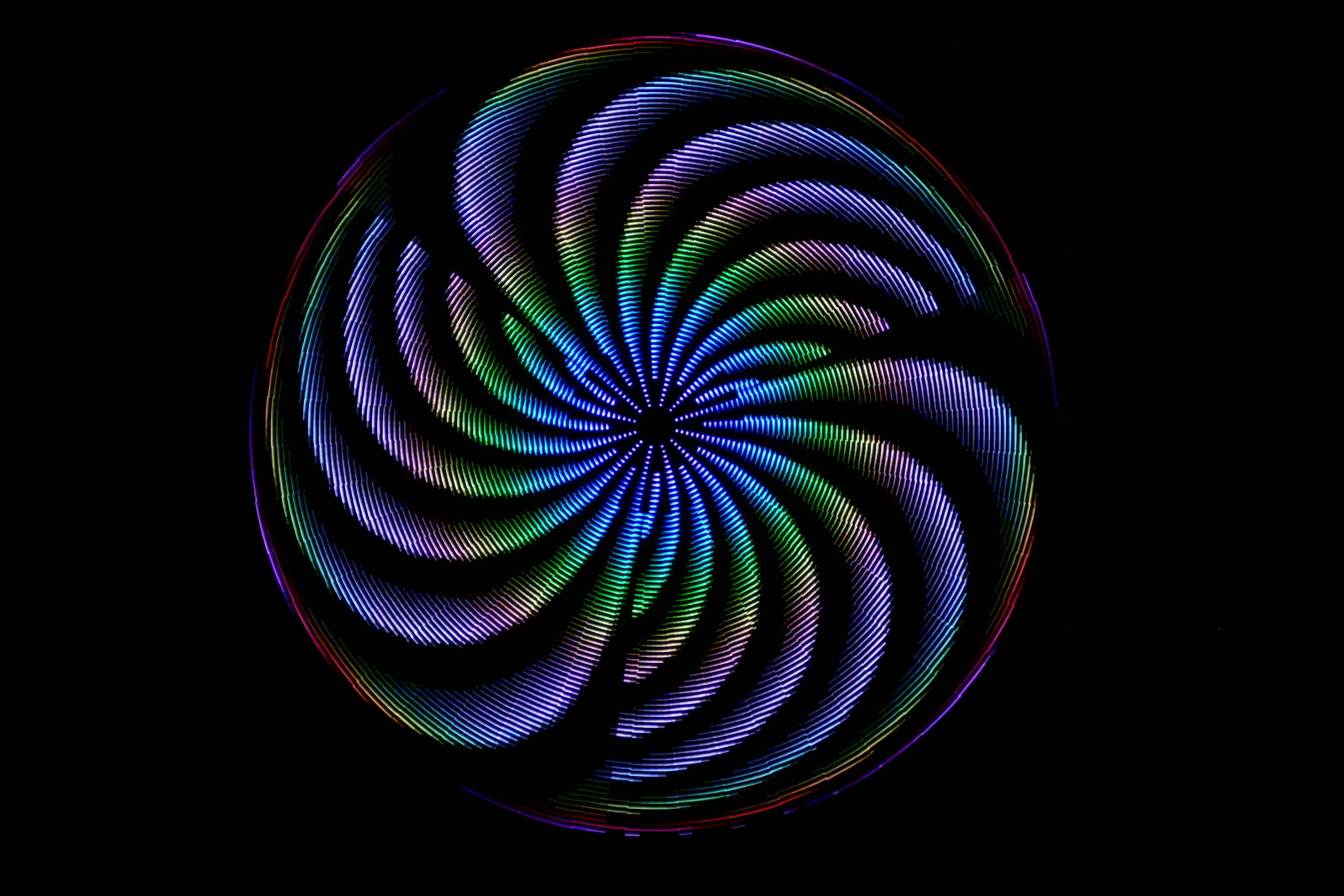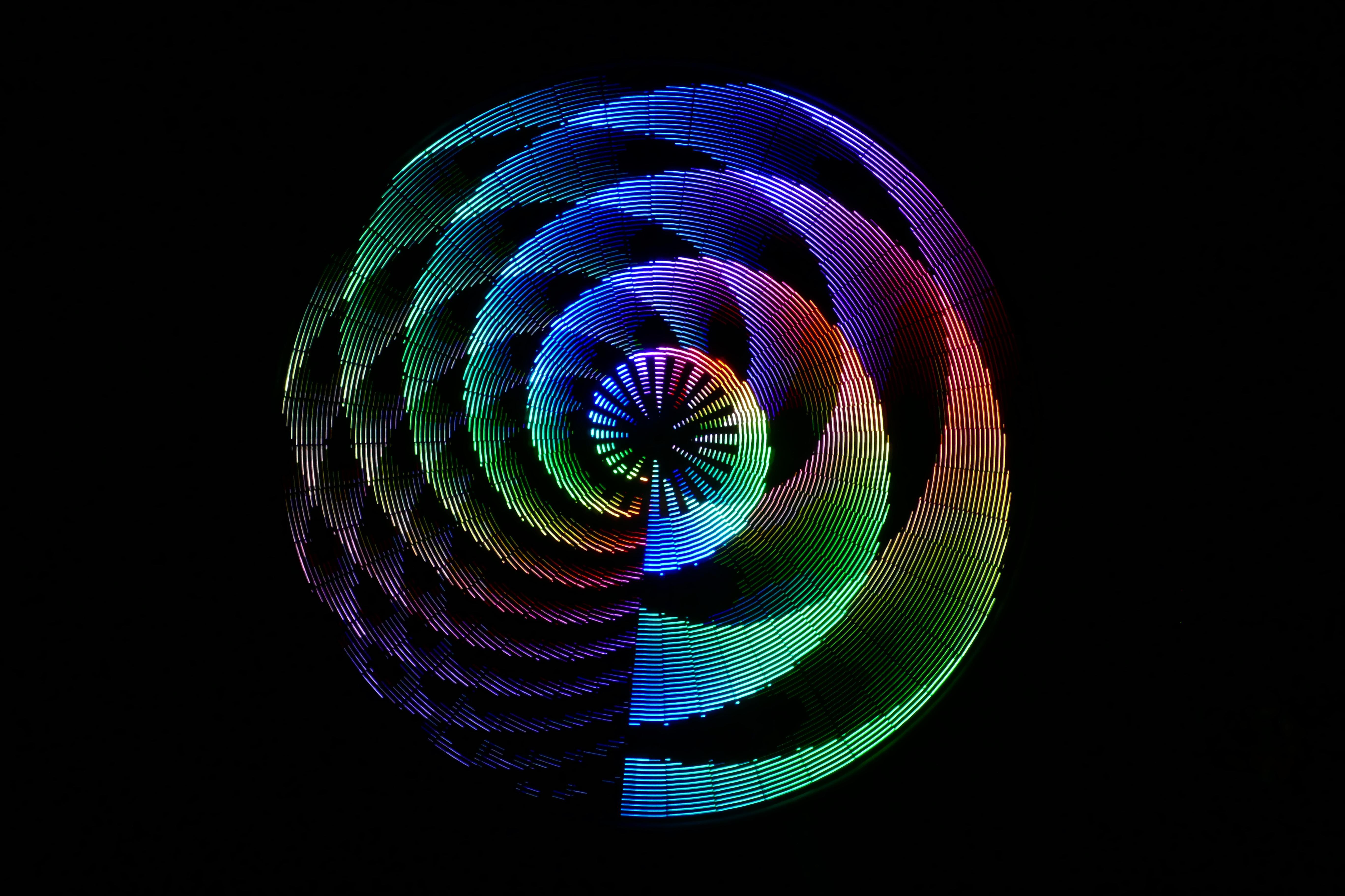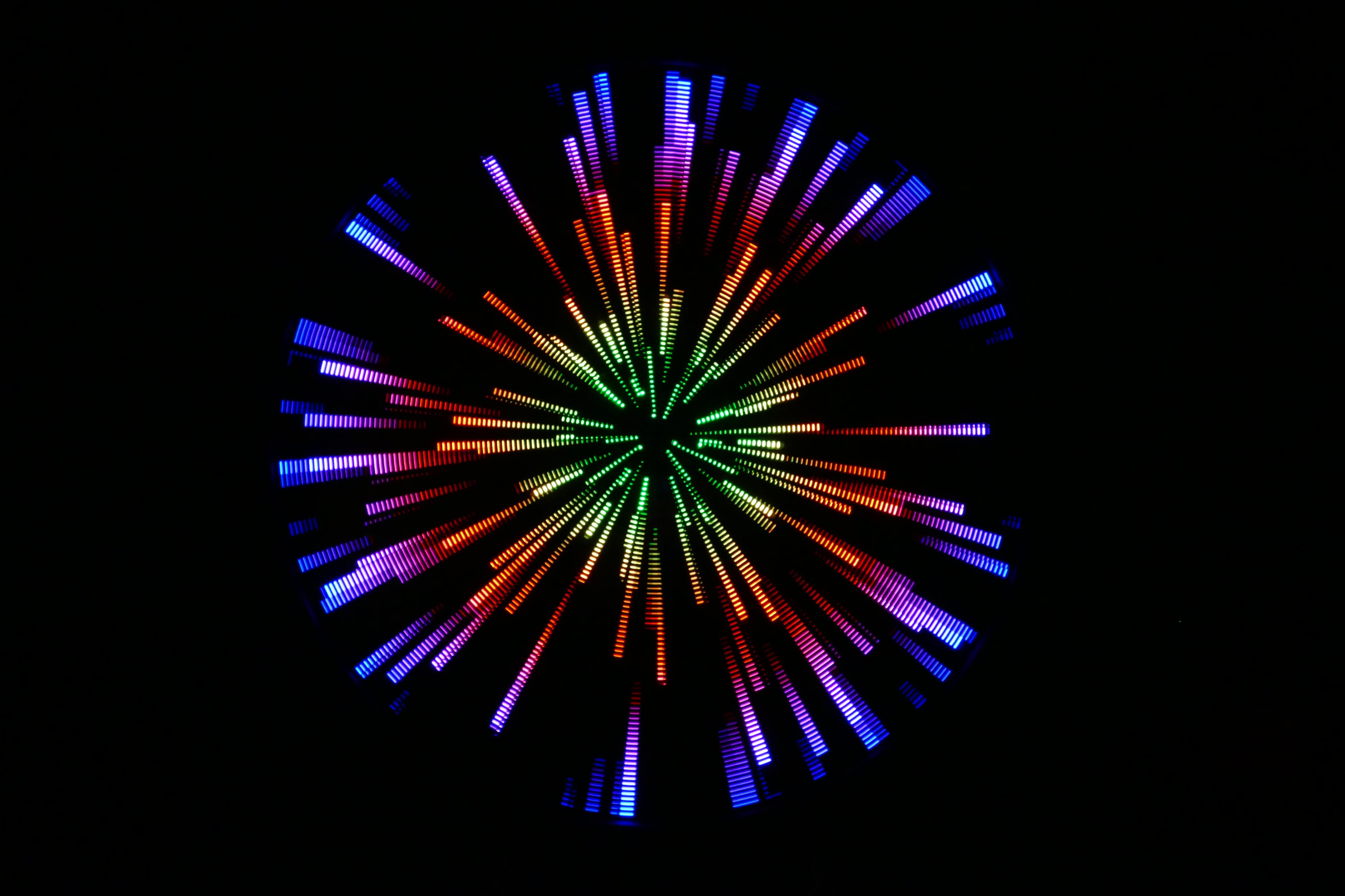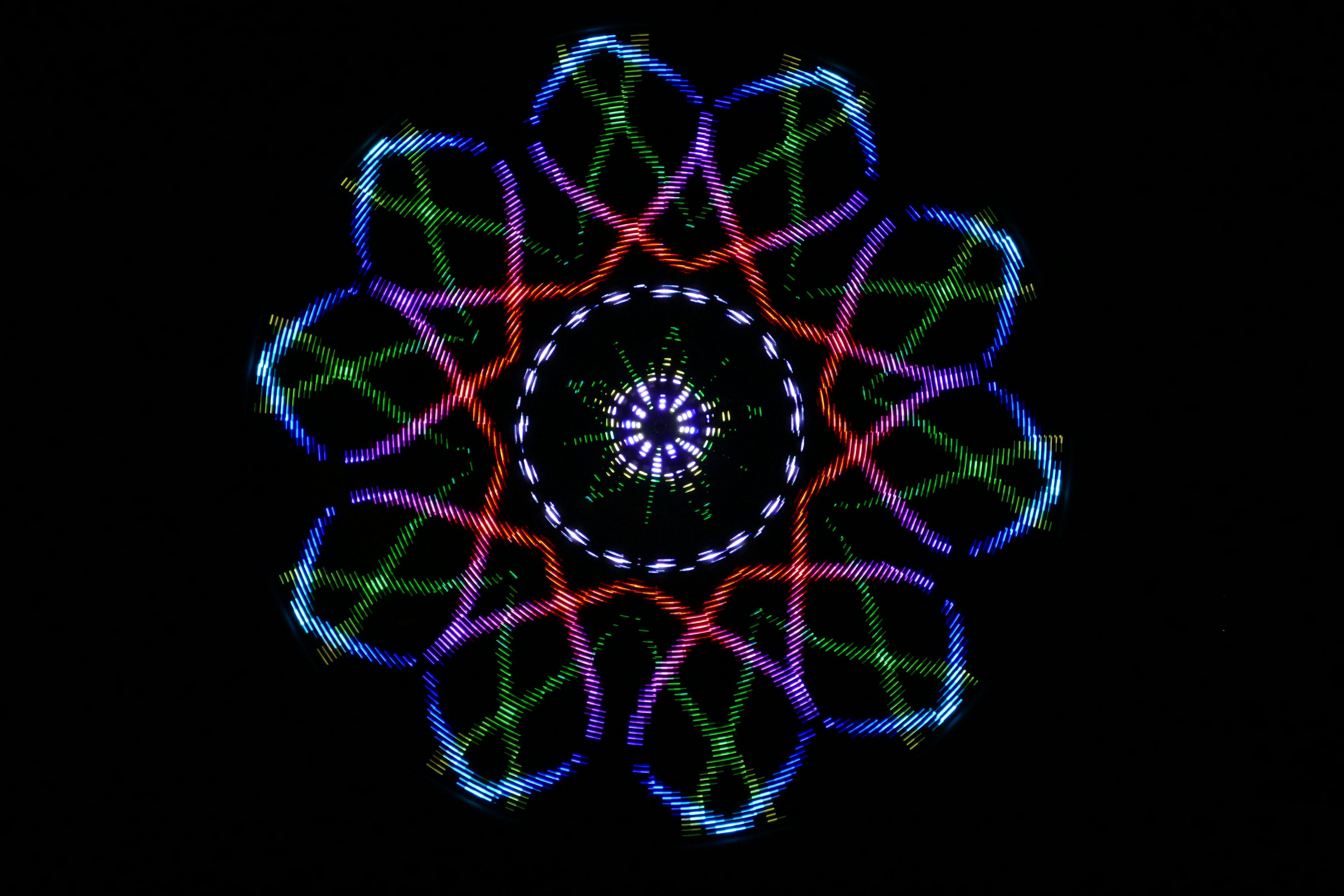 Mesmer is a 88” disc with 3,132 LEDs on 48 spokes. As the disc spins, the LEDs change color for a dazzling variety of animated patterns.