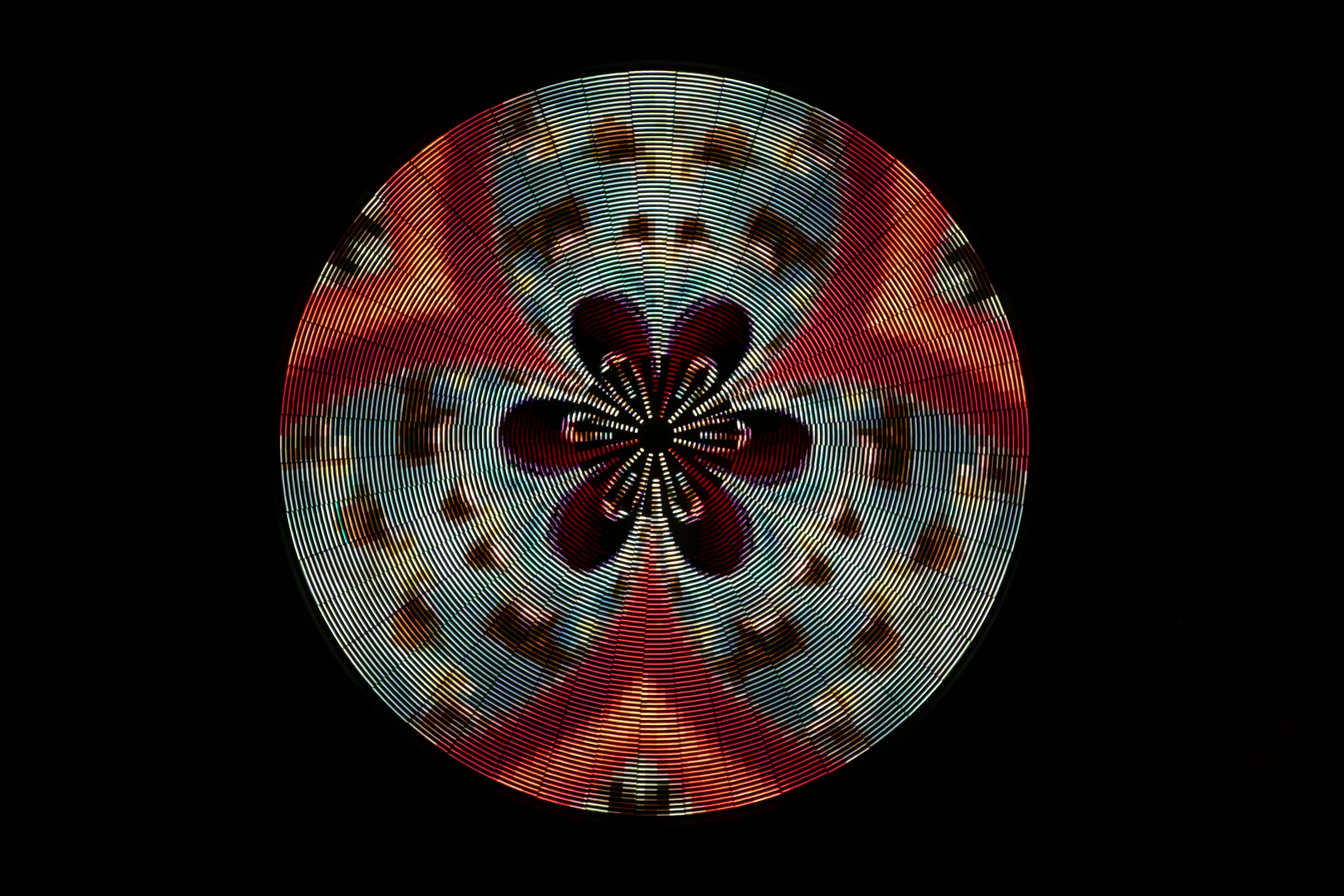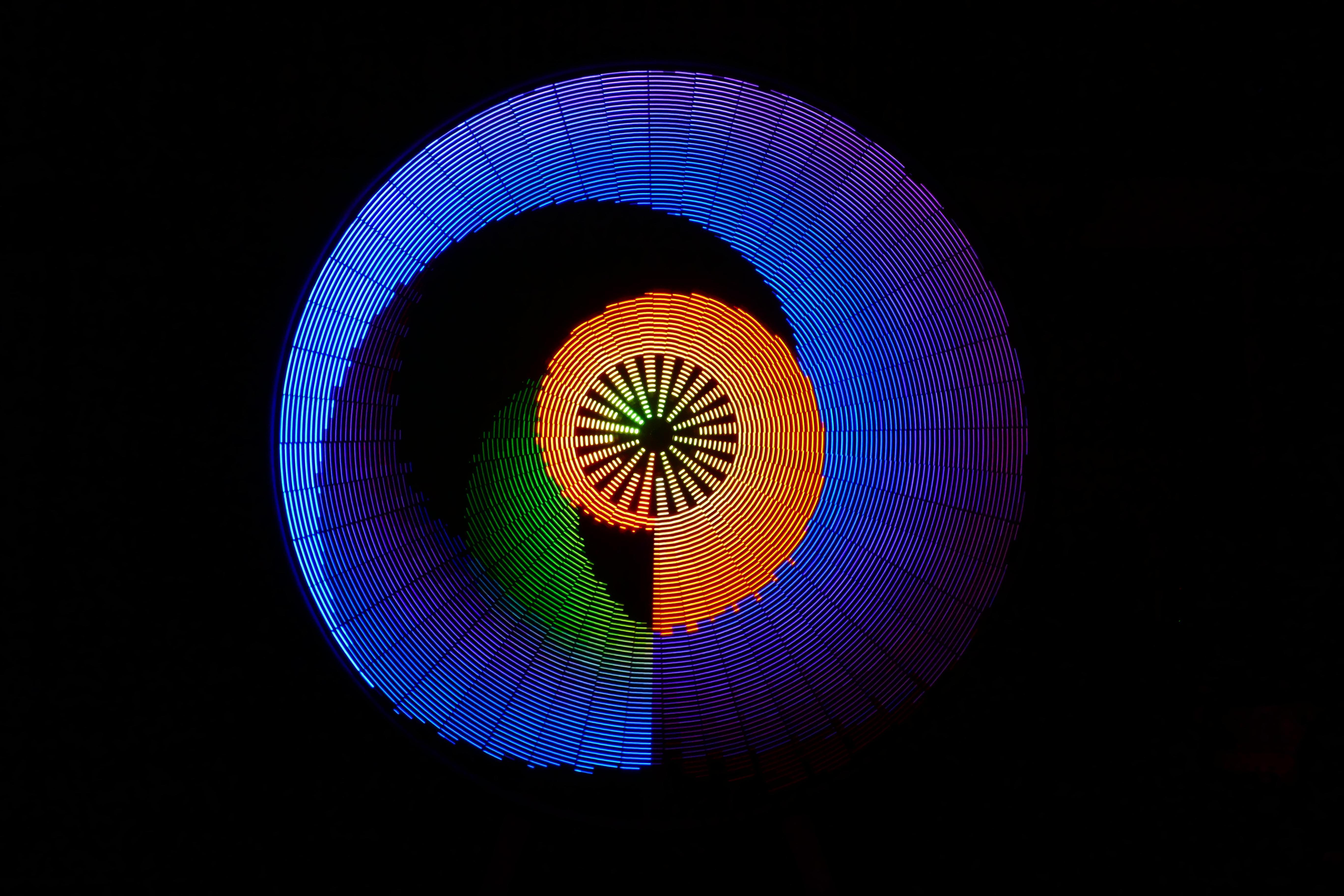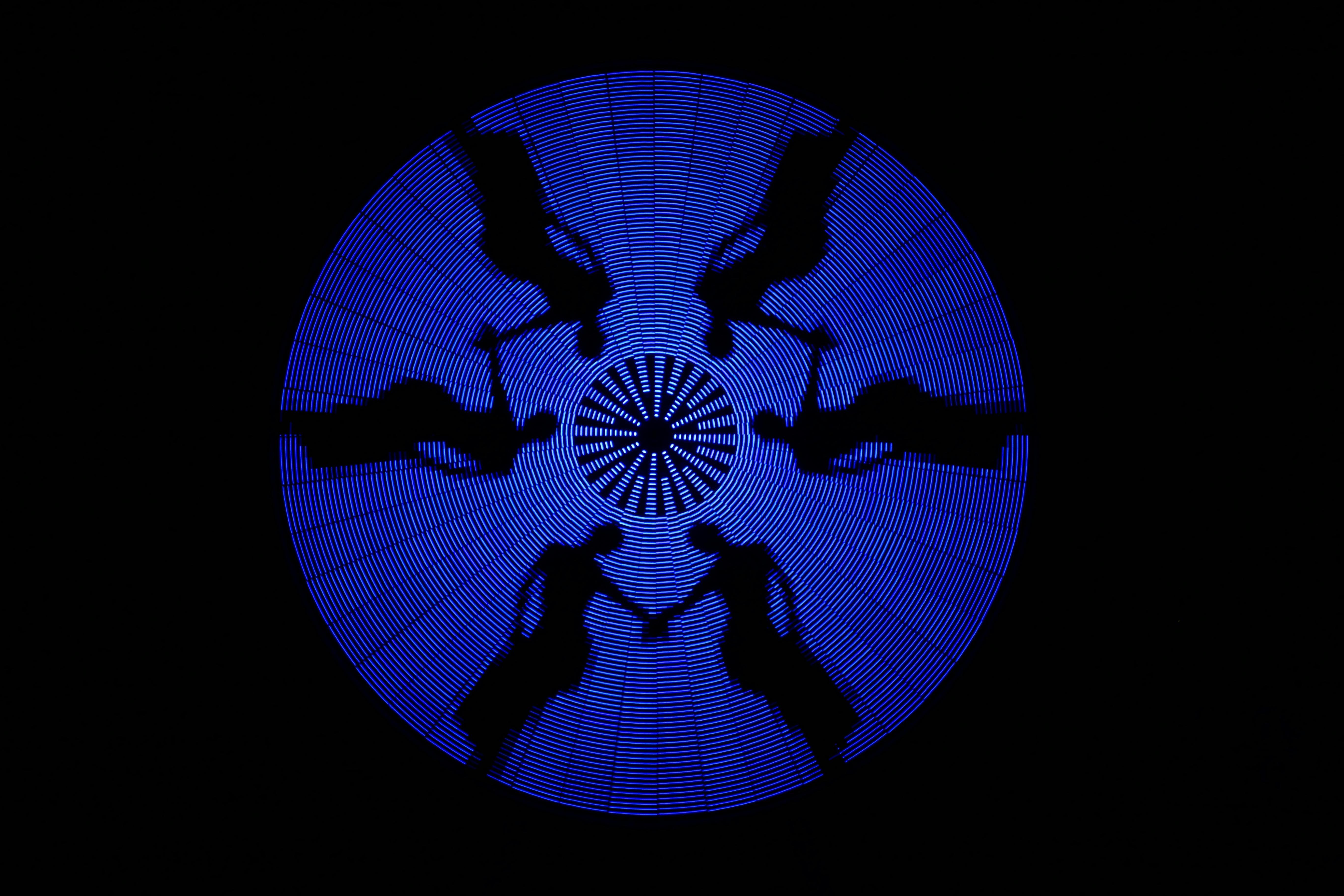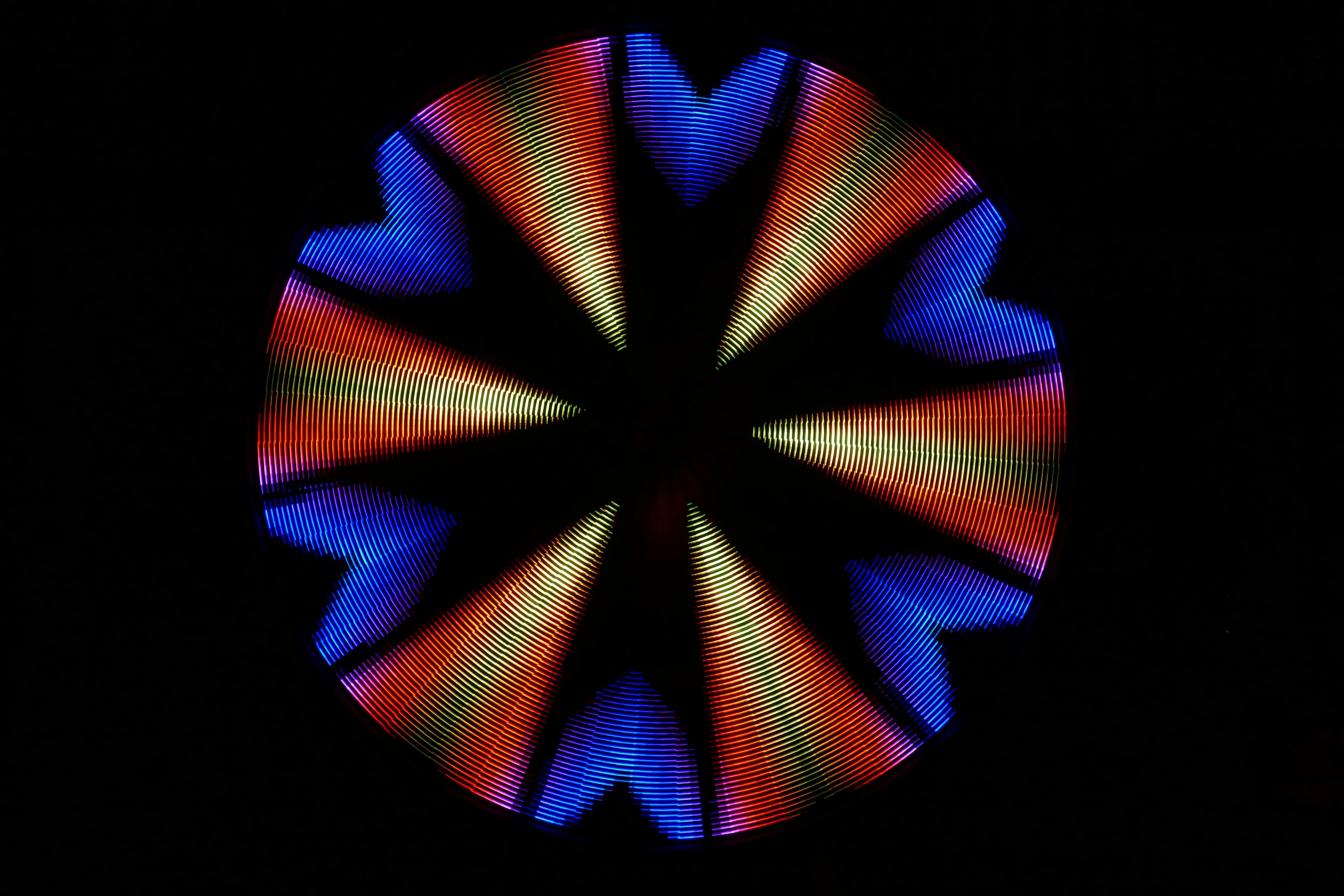 Mesmer is a 88” disc with 3,132 LEDs on 48 spokes. As the disc spins, the LEDs change color for a dazzling variety of animated patterns.