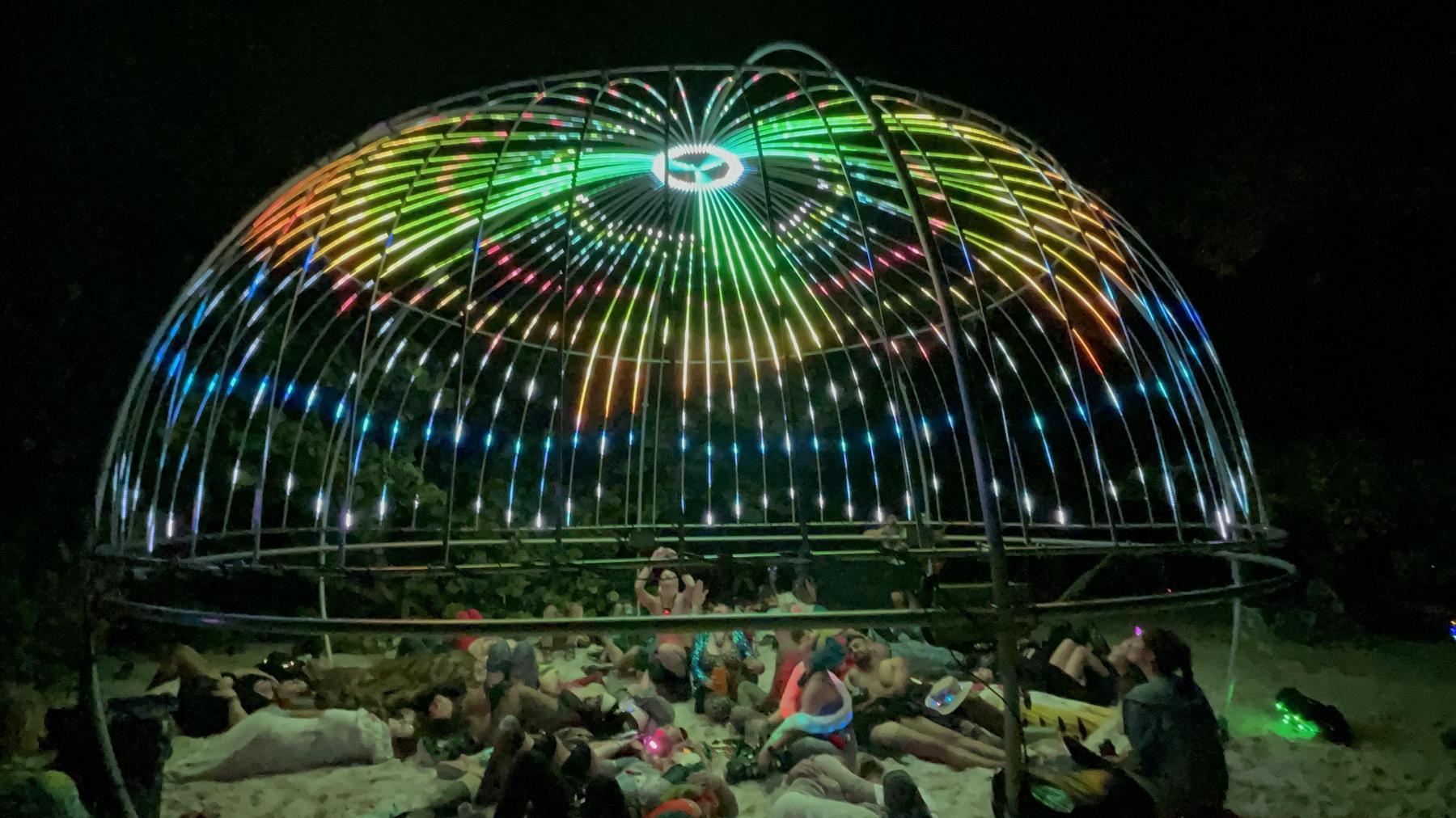 The hemisphere’s structure is that of a 2012 fire art piece called Char Wash. Re-purposing this helps keep the cost down. Rings of aluminum tube are attached to this, and 60 aluminum strips with LED strips are attached to the rings.