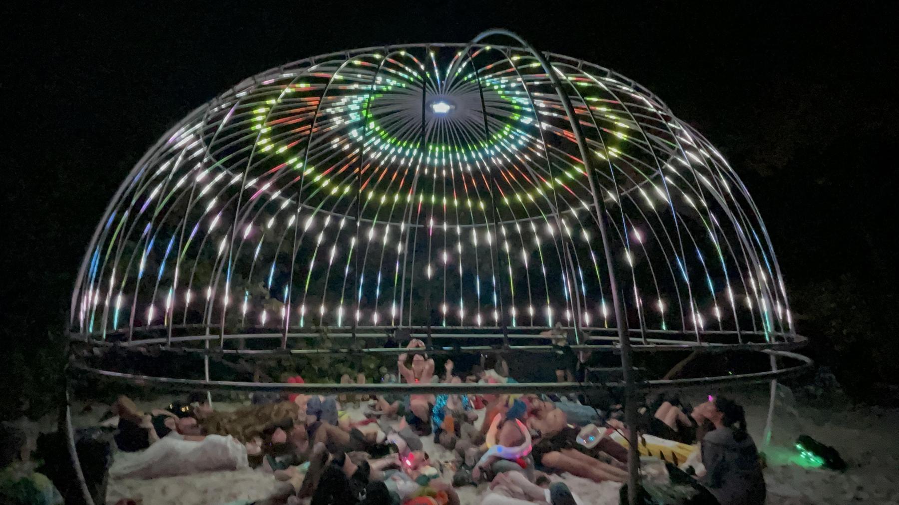 A 26’ diameter hemisphere with 26,000 LEDs on its interior in a radial pattern. Speakers play classical music while patterns of light choreographed to the music dance in every direction a participant can look, completely surrounding him/her both audibly and visibly.