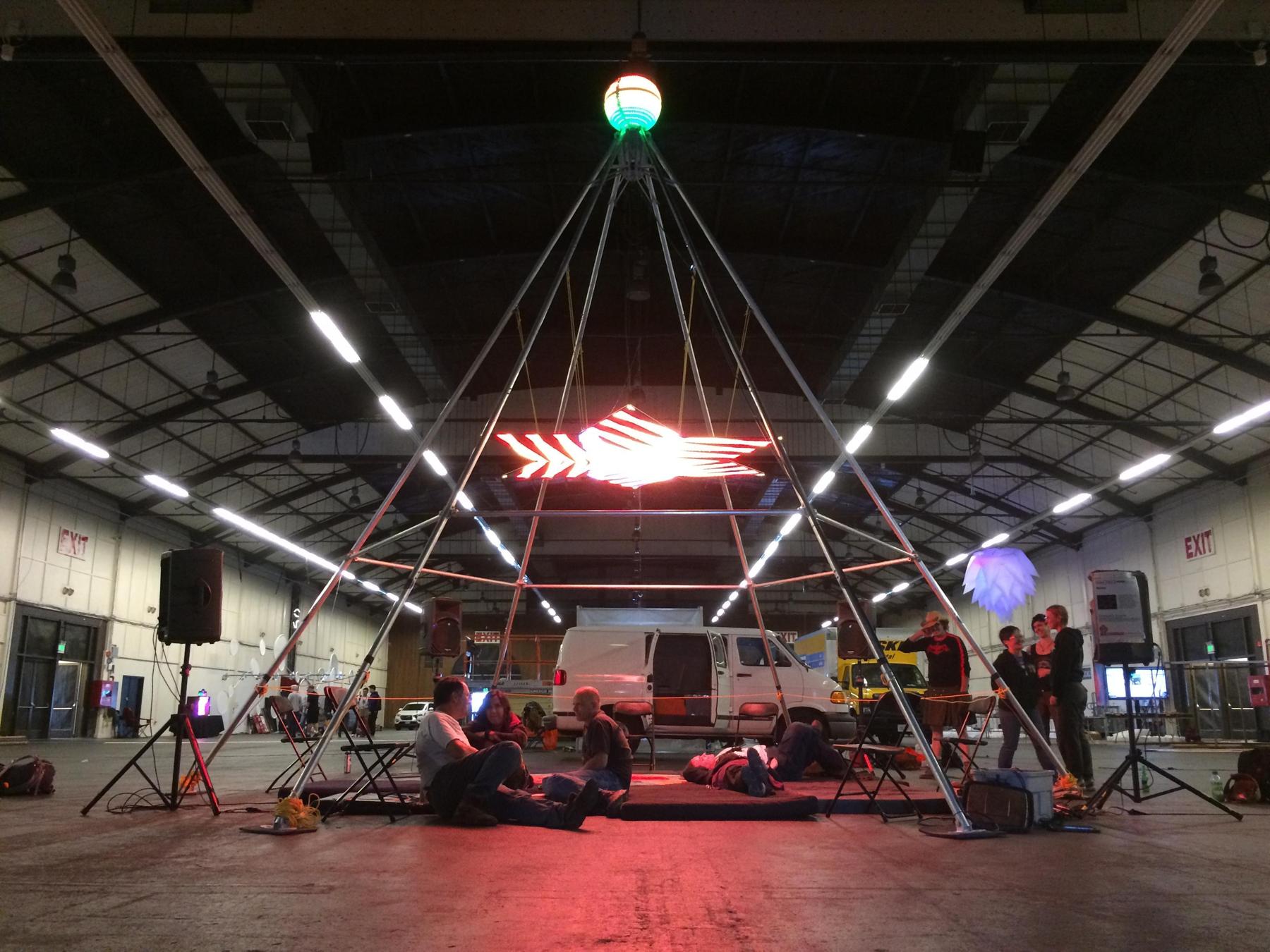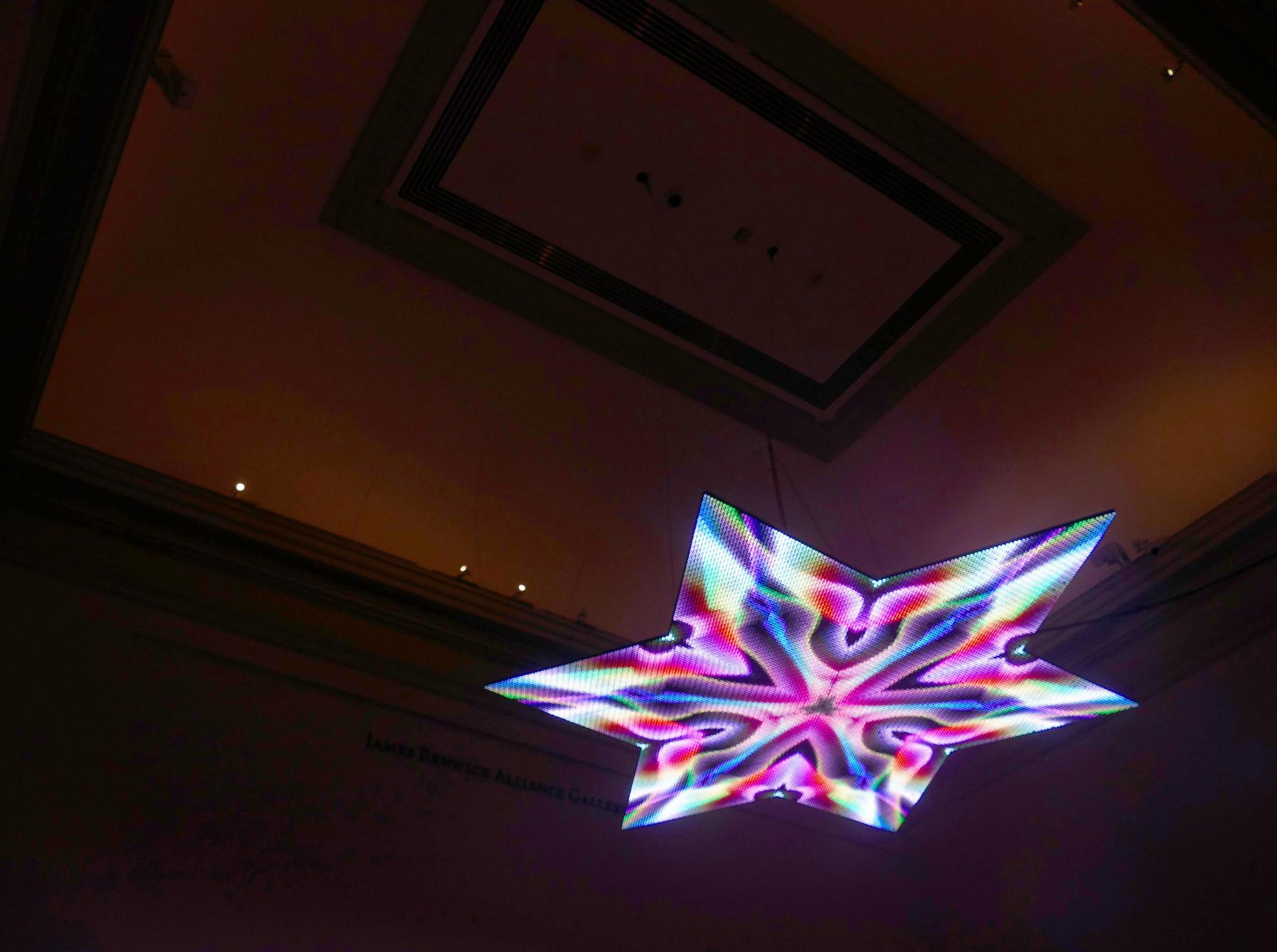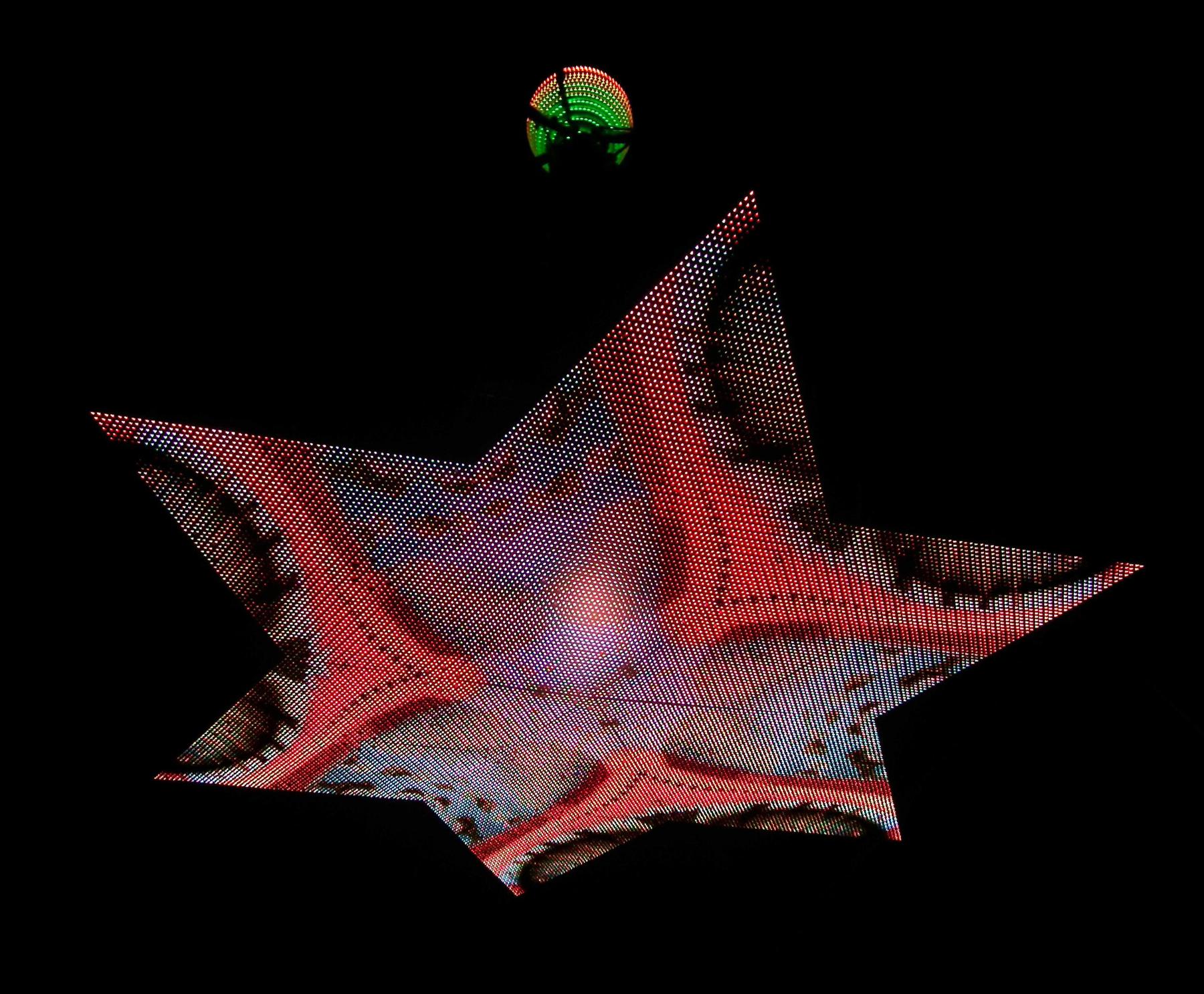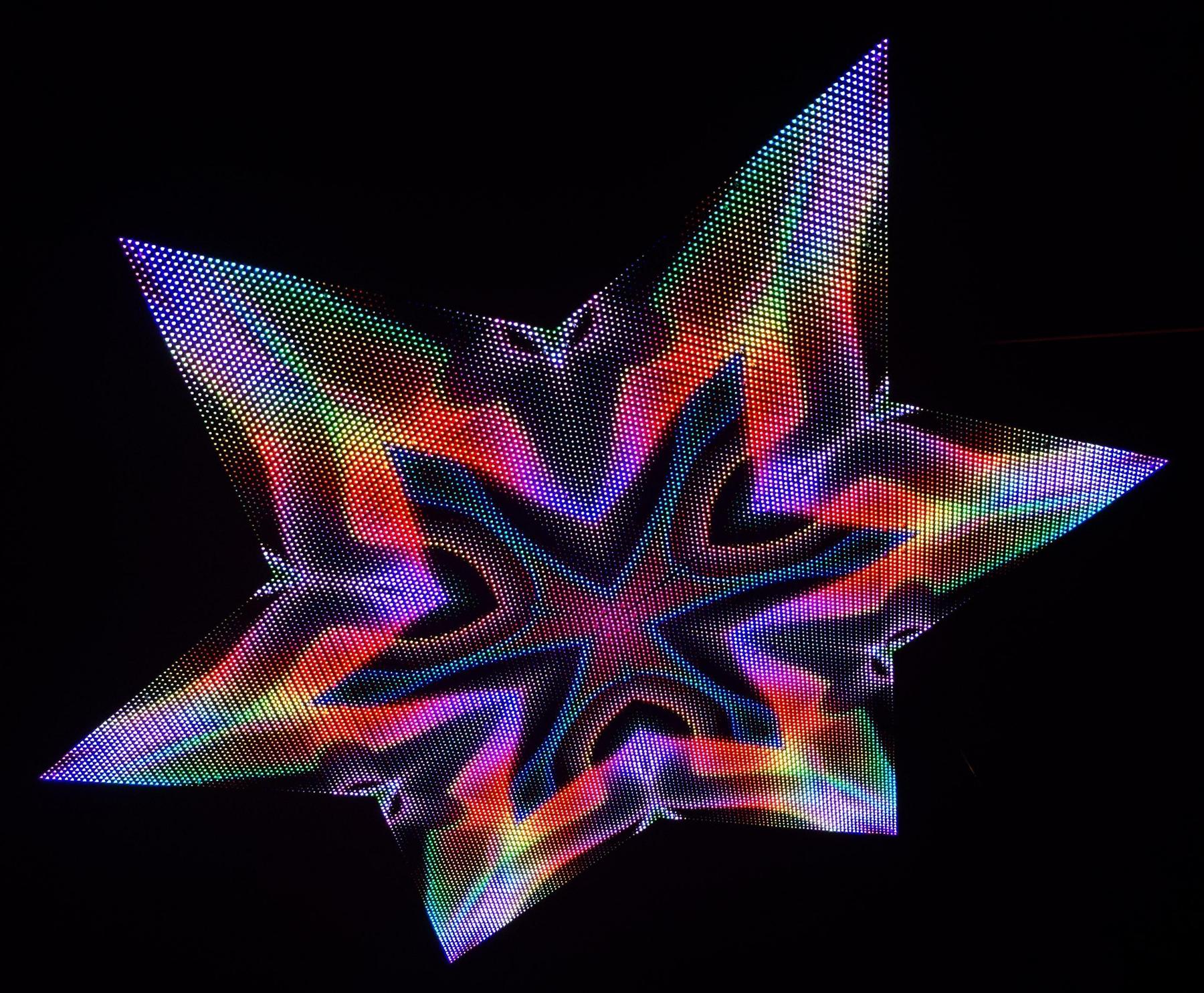 Nova is a 10’ diameter panel of 21,600 LEDs in a 6-pointed star. A computer controls the color and brightness of each LED, creating a vast animated video screen with a triangular grid. The displayed scenes range from majestic celestial images to playful animations to mind-stretching psychedelia.