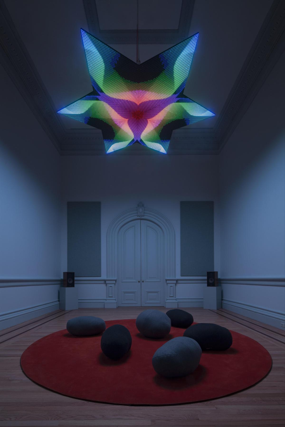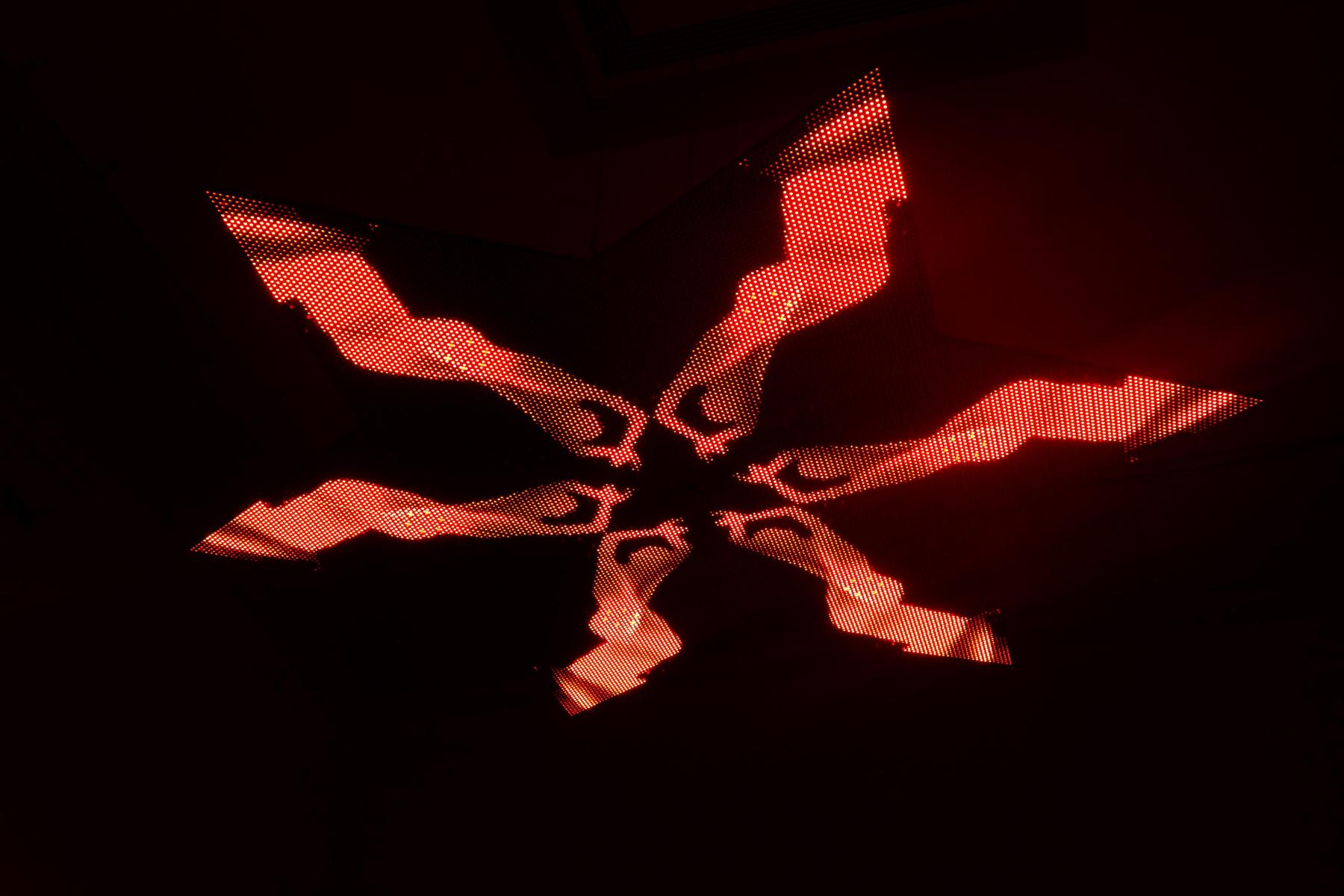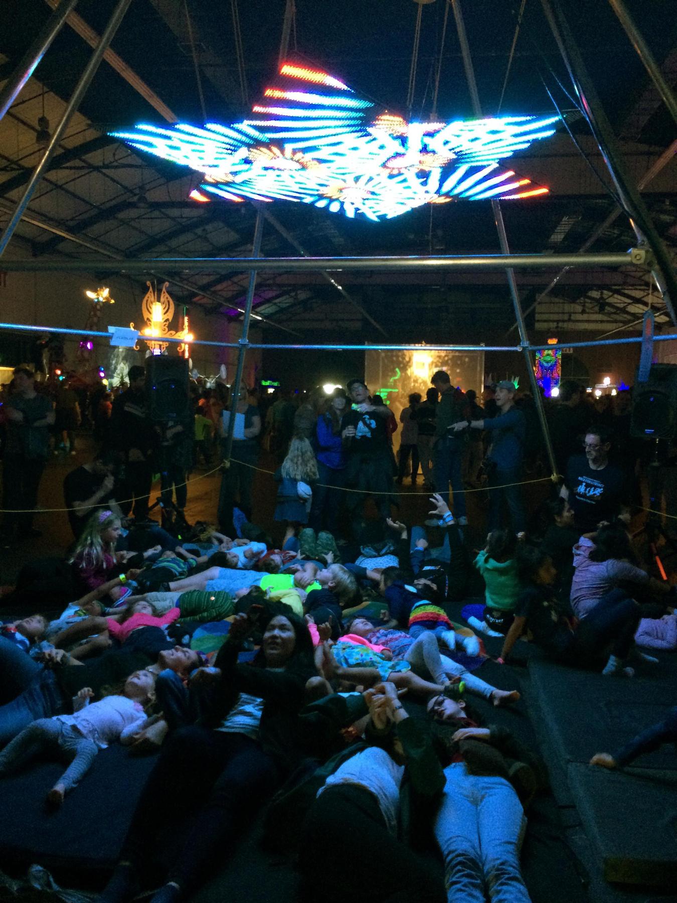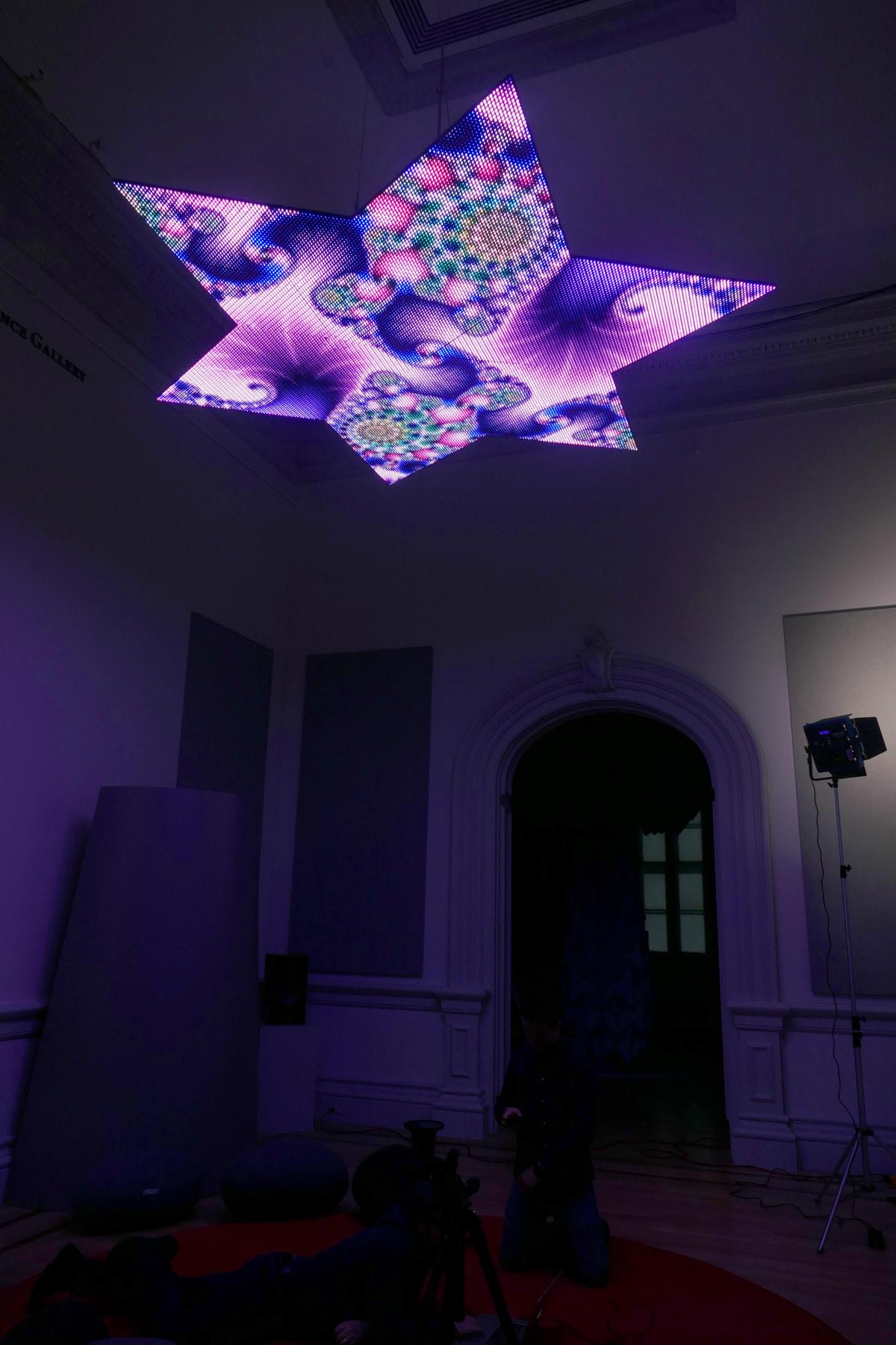 Nova is a 10’ diameter panel of 21,600 LEDs in a 6-pointed star. A computer controls the color and brightness of each LED, creating a vast animated video screen with a triangular grid. The displayed scenes range from majestic celestial images to playful animations to mind-stretching psychedelia.