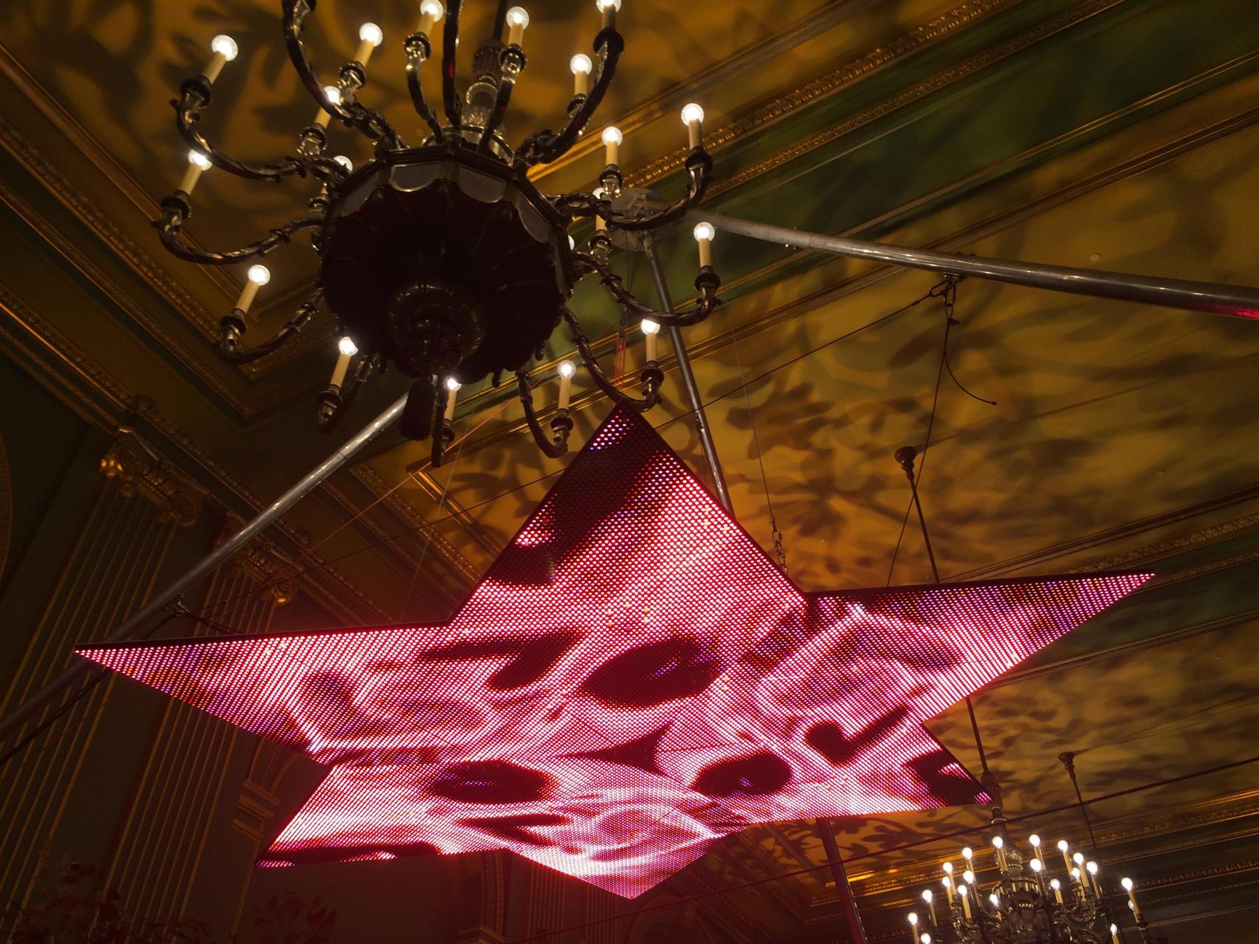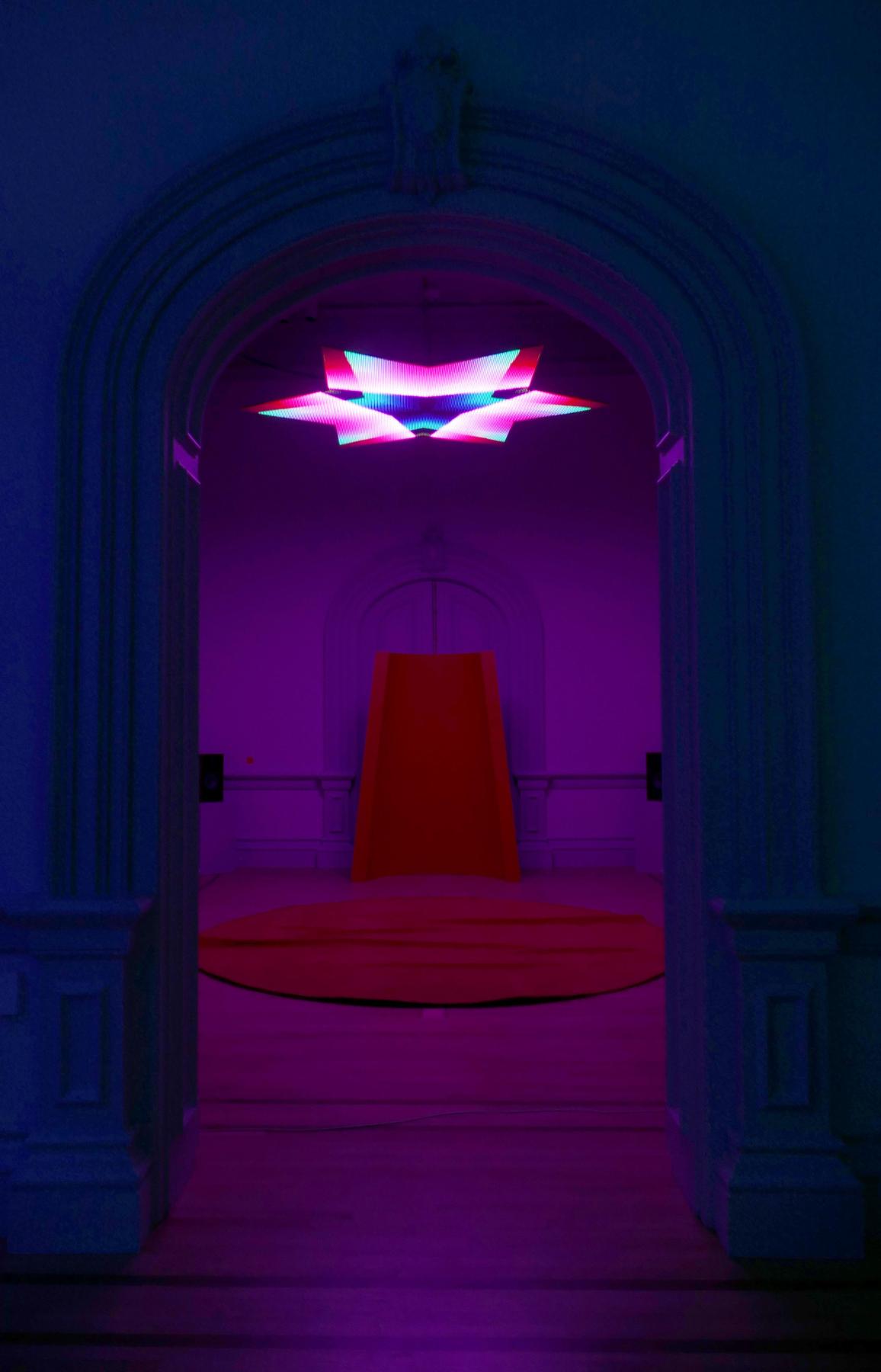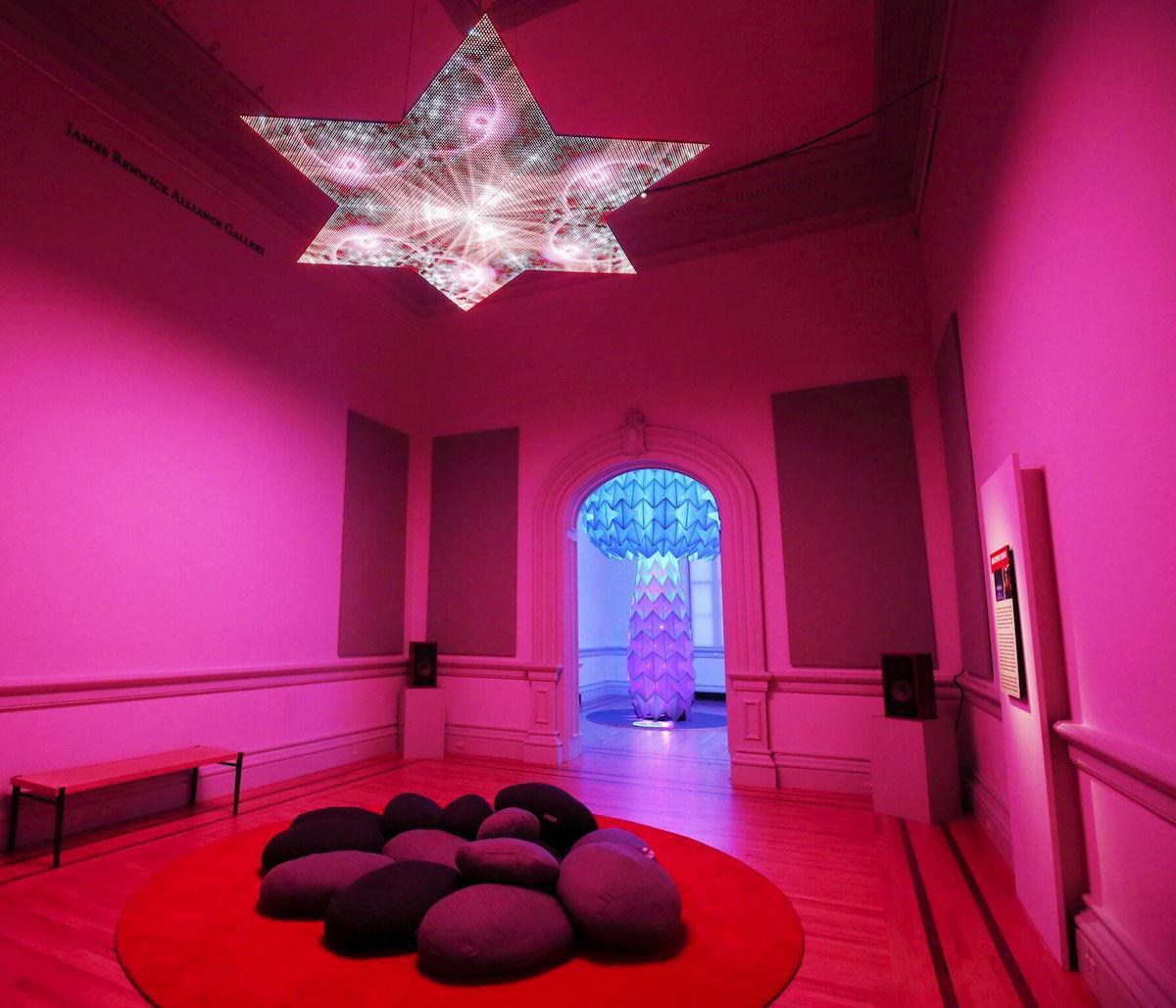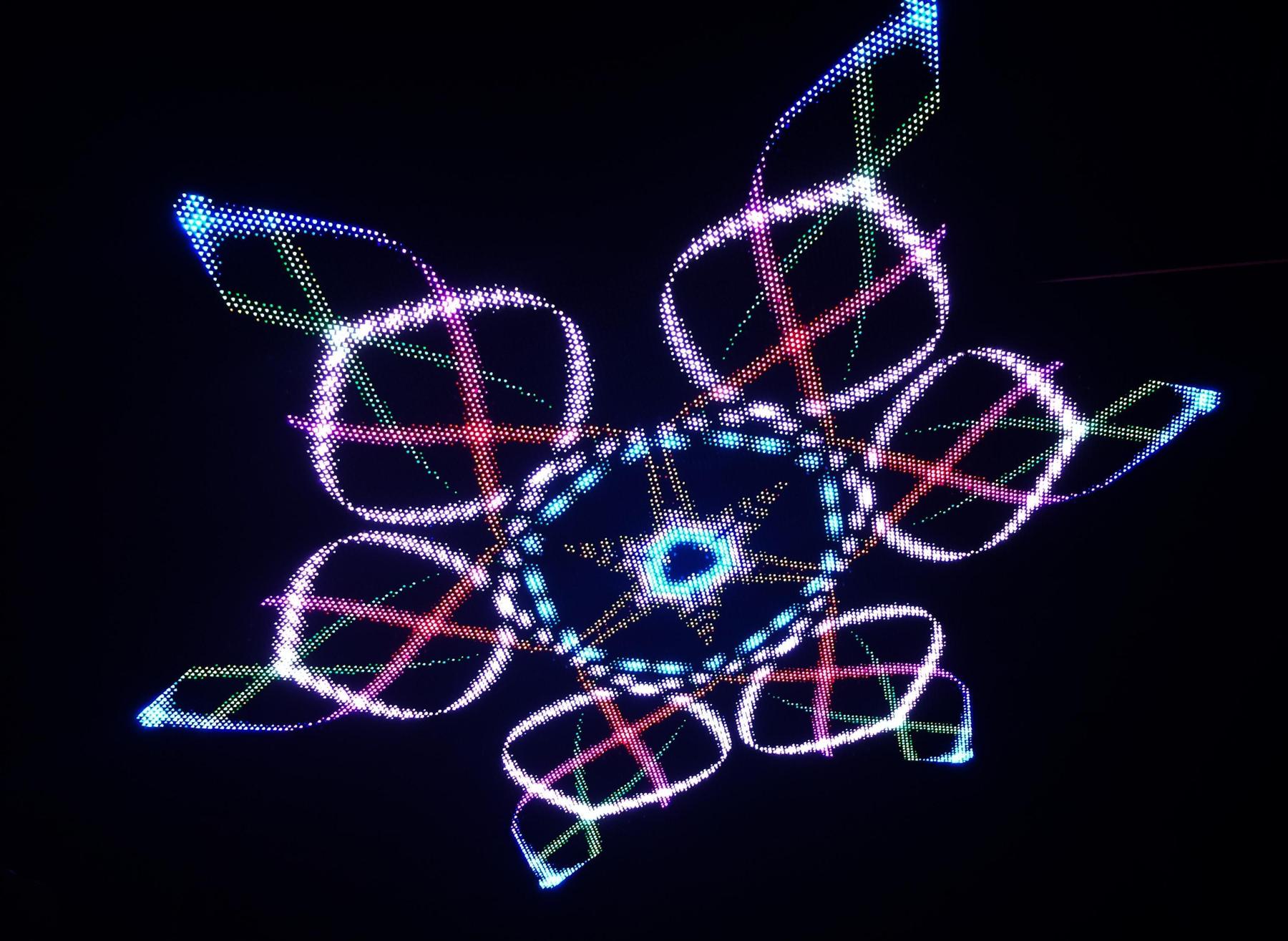 Nova is a 10’ diameter panel of 21,600 LEDs in a 6-pointed star. A computer controls the color and brightness of each LED, creating a vast animated video screen with a triangular grid. The displayed scenes range from majestic celestial images to playful animations to mind-stretching psychedelia.