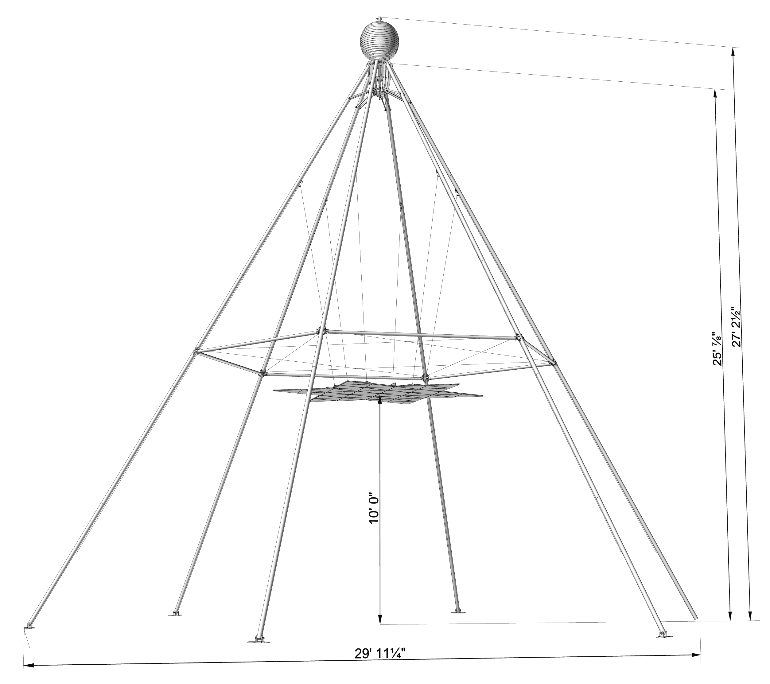 Nova can be installed in various ways. Most of the time it hangs in a horizontal orientation, viewed from below. Since it weighs only about 150lbs it can be supported by most exposed beams or joists. It can also be suspended by an easily-transportable aluminum tripod. It can also be hung in a vertical orientation to be viewed from the side.