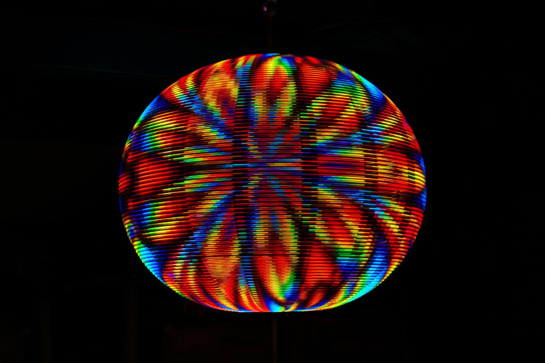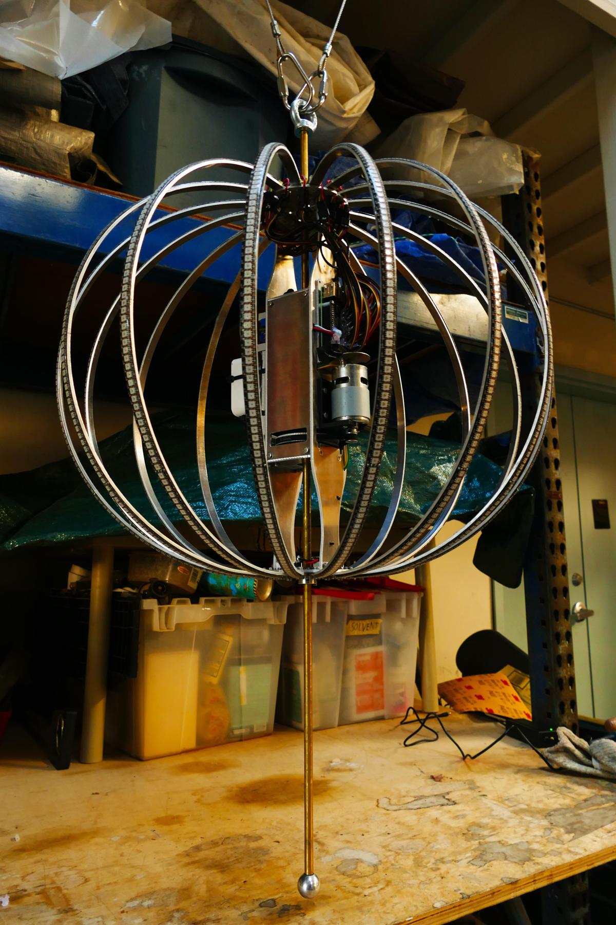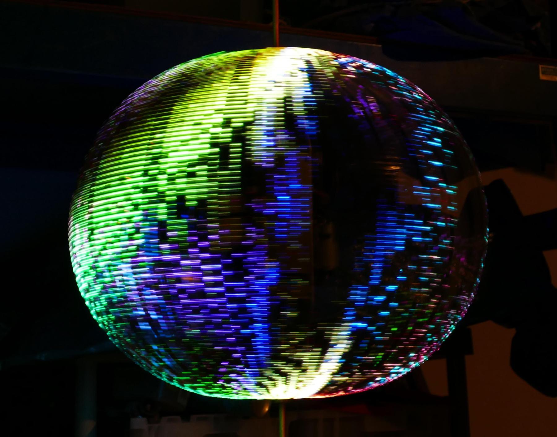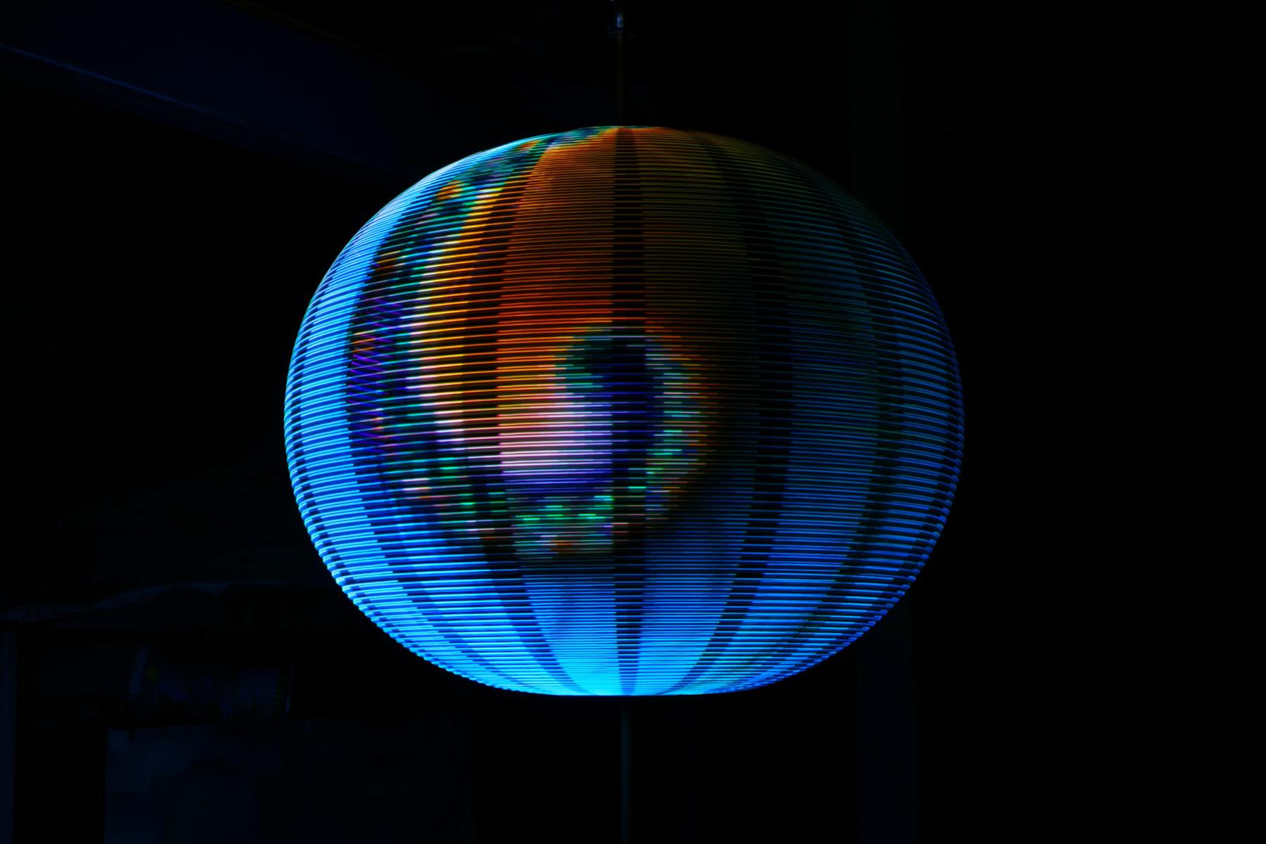 Sceptre is a kinetic LED sculpture. Around a vertical shaft are 16 semicircular hoops of aluminum. Each of these has 102 full-color LEDs facing outward. When the shaft spins, a computer system keeps track of the angle of the shaft and changes the colors of the LEDs at just the right time to present a static image that appears to hover in mid-air (making use of the eye's persistence-of-vision characteristic).