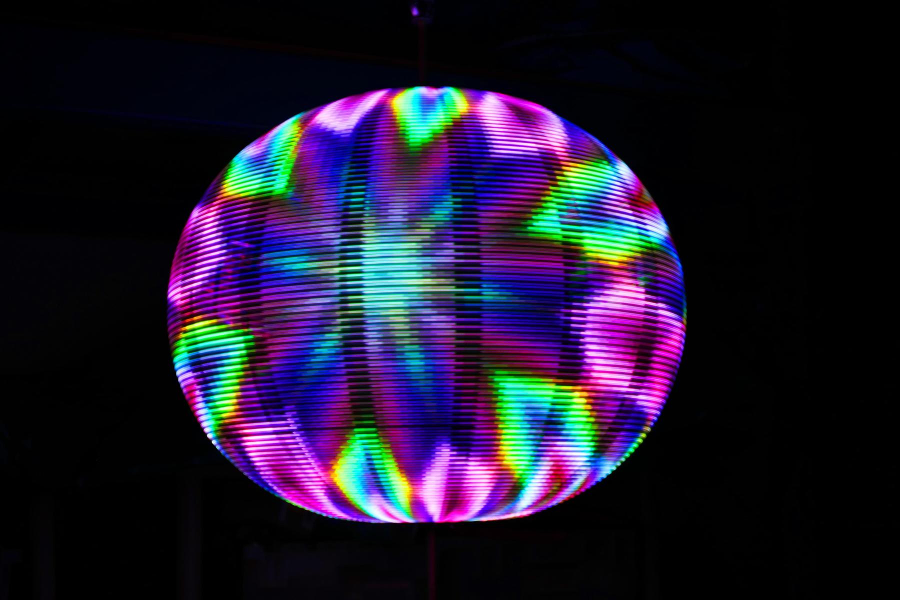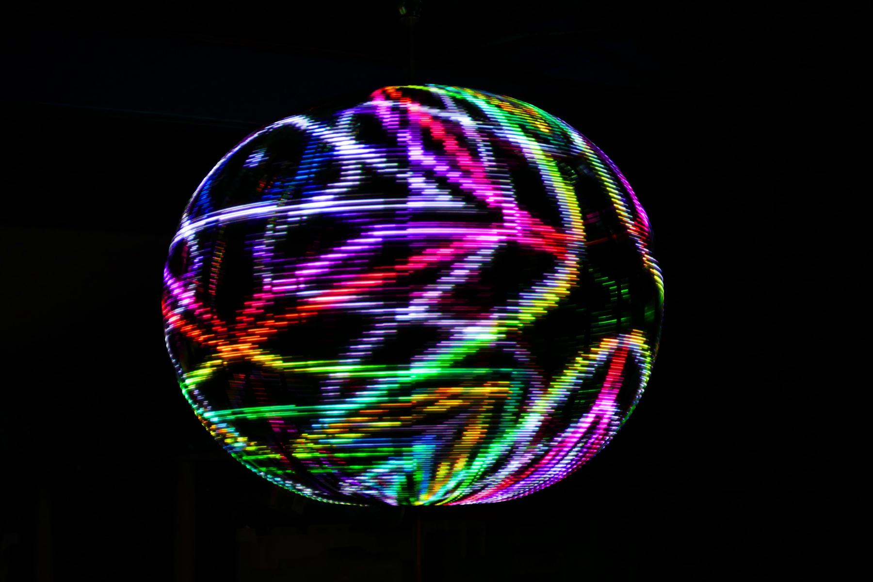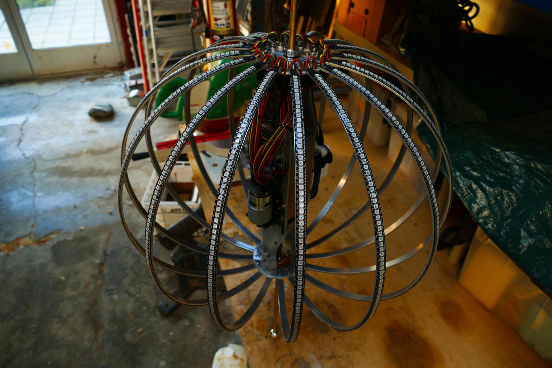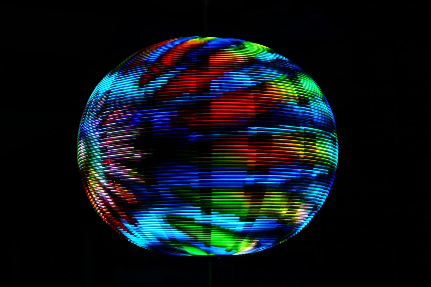 Sceptre is a kinetic LED sculpture. Around a vertical shaft are 16 semicircular hoops of aluminum. Each of these has 102 full-color LEDs facing outward. When the shaft spins, a computer system keeps track of the angle of the shaft and changes the colors of the LEDs at just the right time to present a static image that appears to hover in mid-air (making use of the eye's persistence-of-vision characteristic).